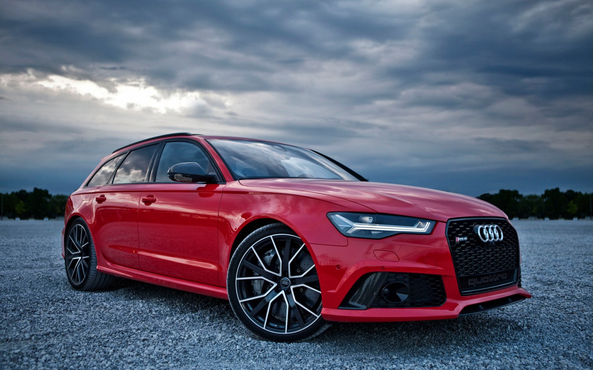 Description: A red car parked in a parking lot under a cloudy sky with clouds in the background and a black rim.