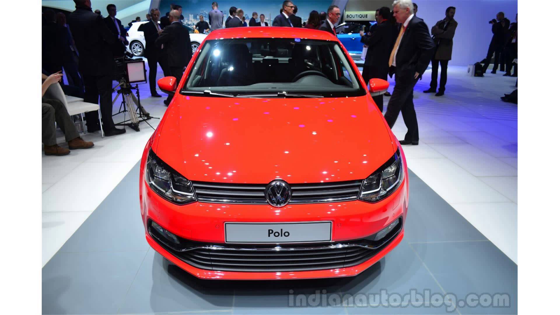 Description: A red car is on display at a showroom with people around it and a blue background behind it.