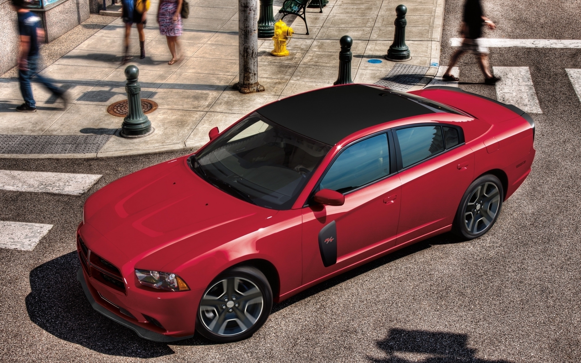 Description: A red car parked on the side of the road near a sidewalk and people walking on the sidewalk near a building.
