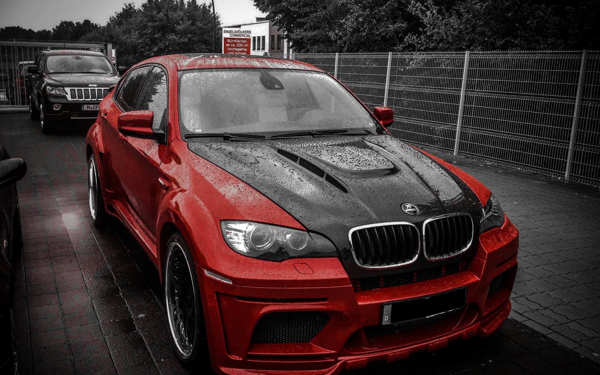 Description: A red car parked on a street next to a fence and a fenced in area with a fence.