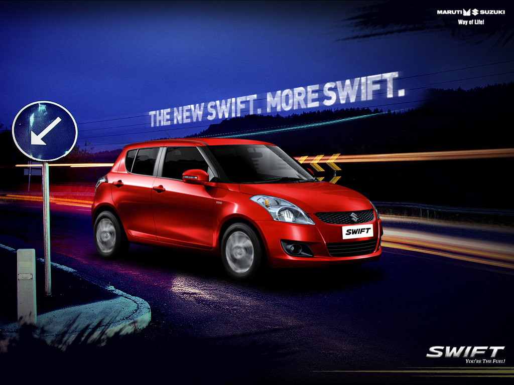 Description: A red car driving down a street next to a street sign with a blue sky in the background and a sign that says the new swift more swift swift swift.