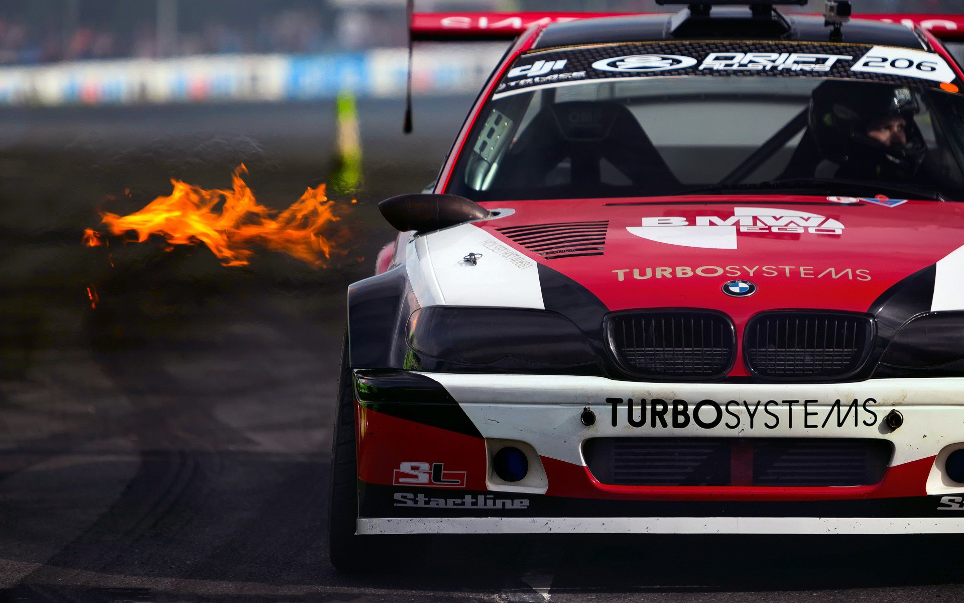 Description: A red car with a white stripe on it driving down a track with a fire coming out of the front.