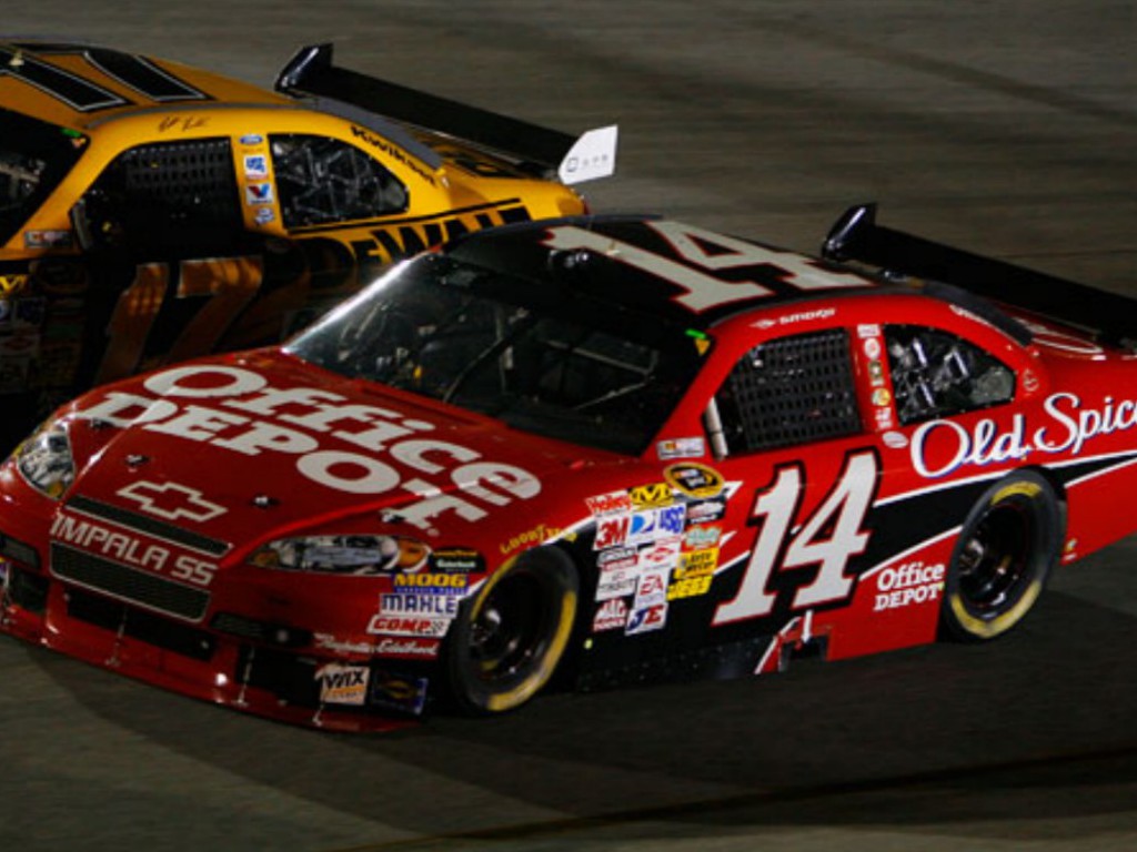 Description: A red car with a yellow car behind it on a track at night time with a yellow car behind it.