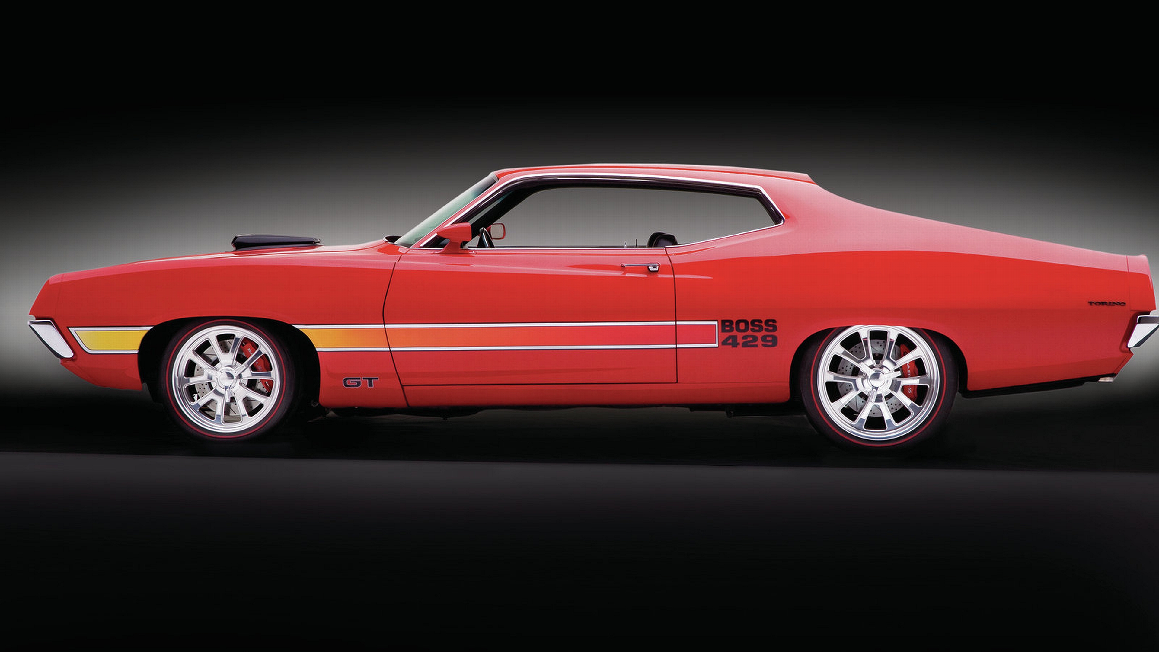 Description: A red car with a yellow stripe on the side of it's hood and a black background behind it.