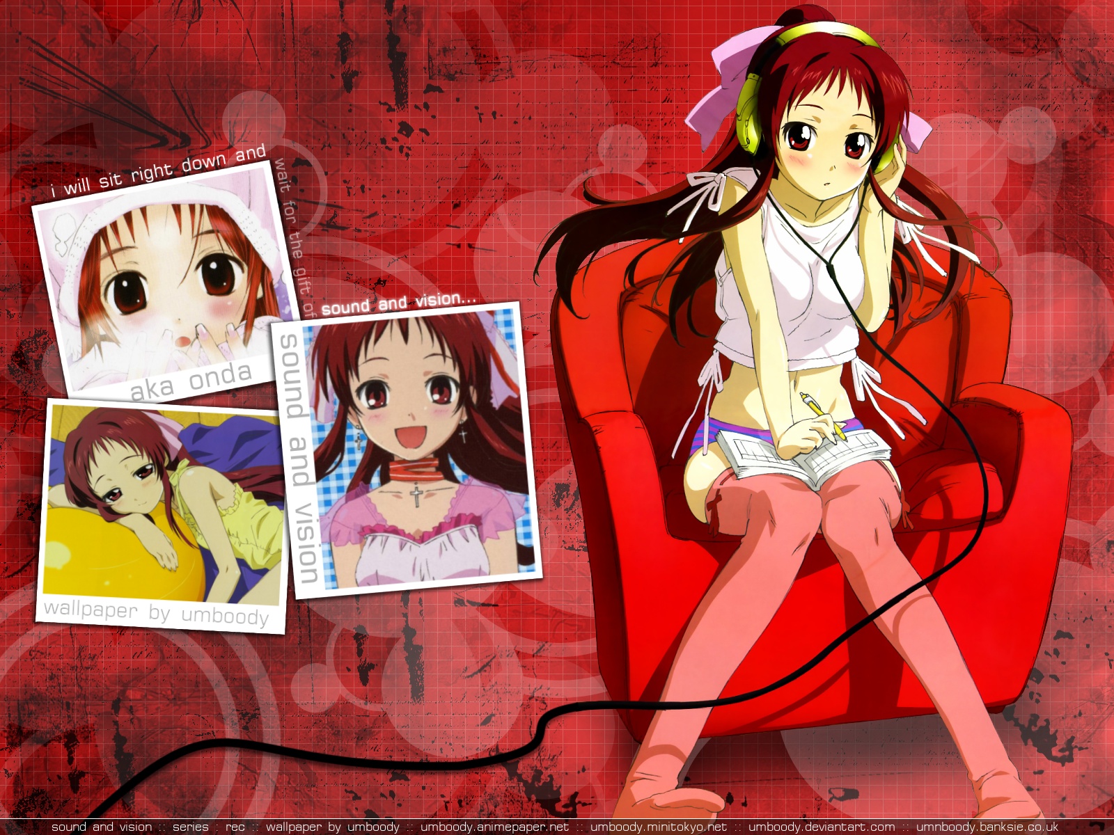 Description: A girl sitting on a red chair with pictures of her and her hair in the air and a red background.