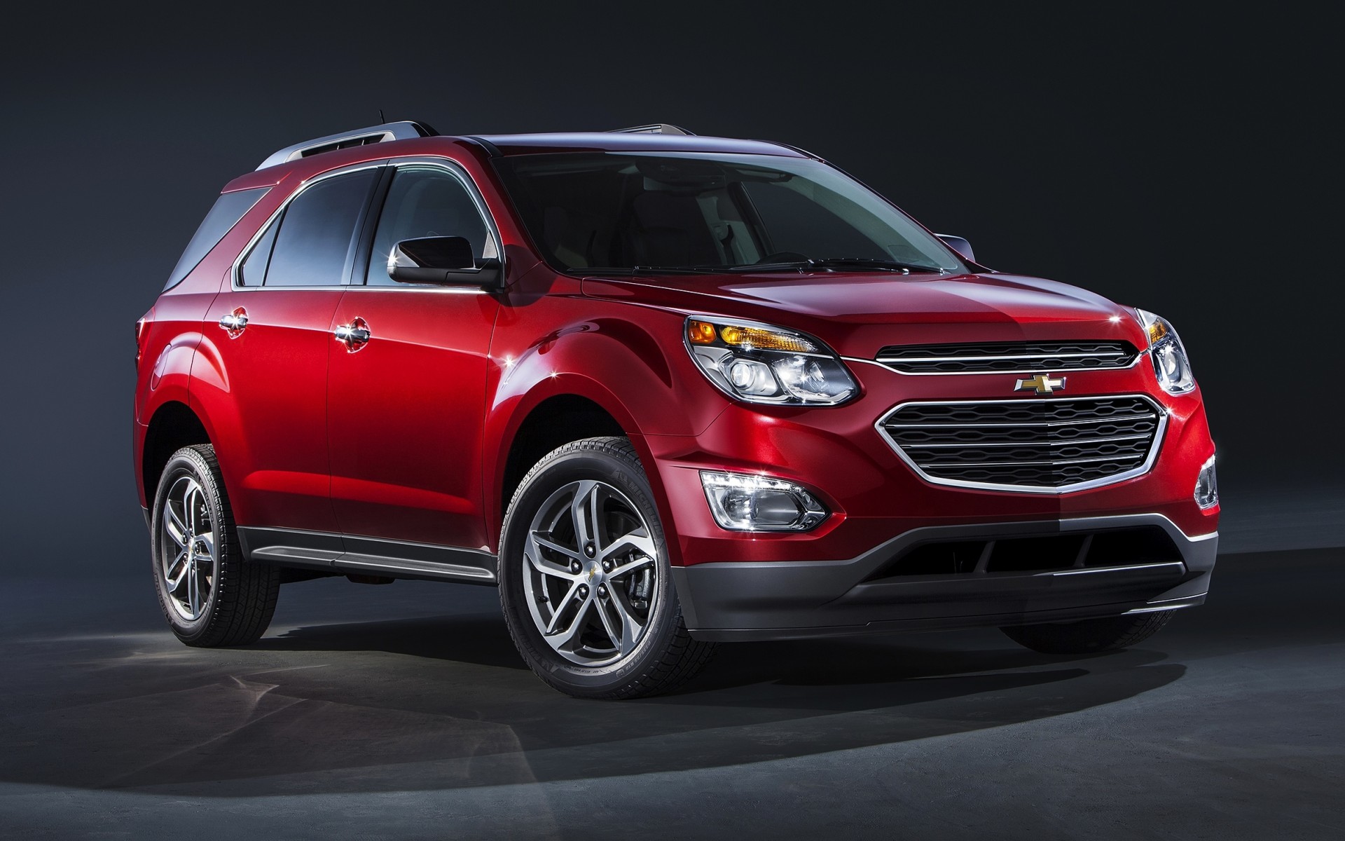Description: A red chevrolet suv is shown in a studio setting with a black background and a gray background behind it.