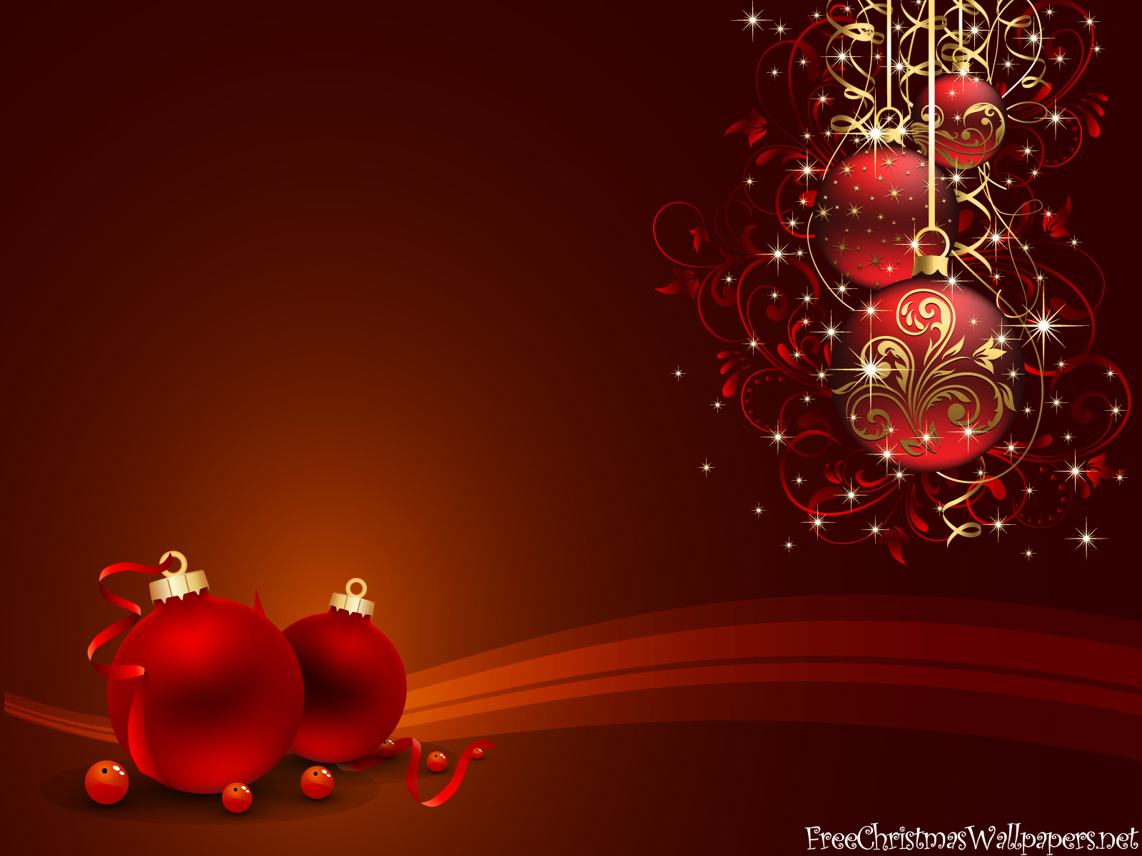 Description: A red christmas card with two red balls and a gold ornament hanging from a red ribbon on a red background.