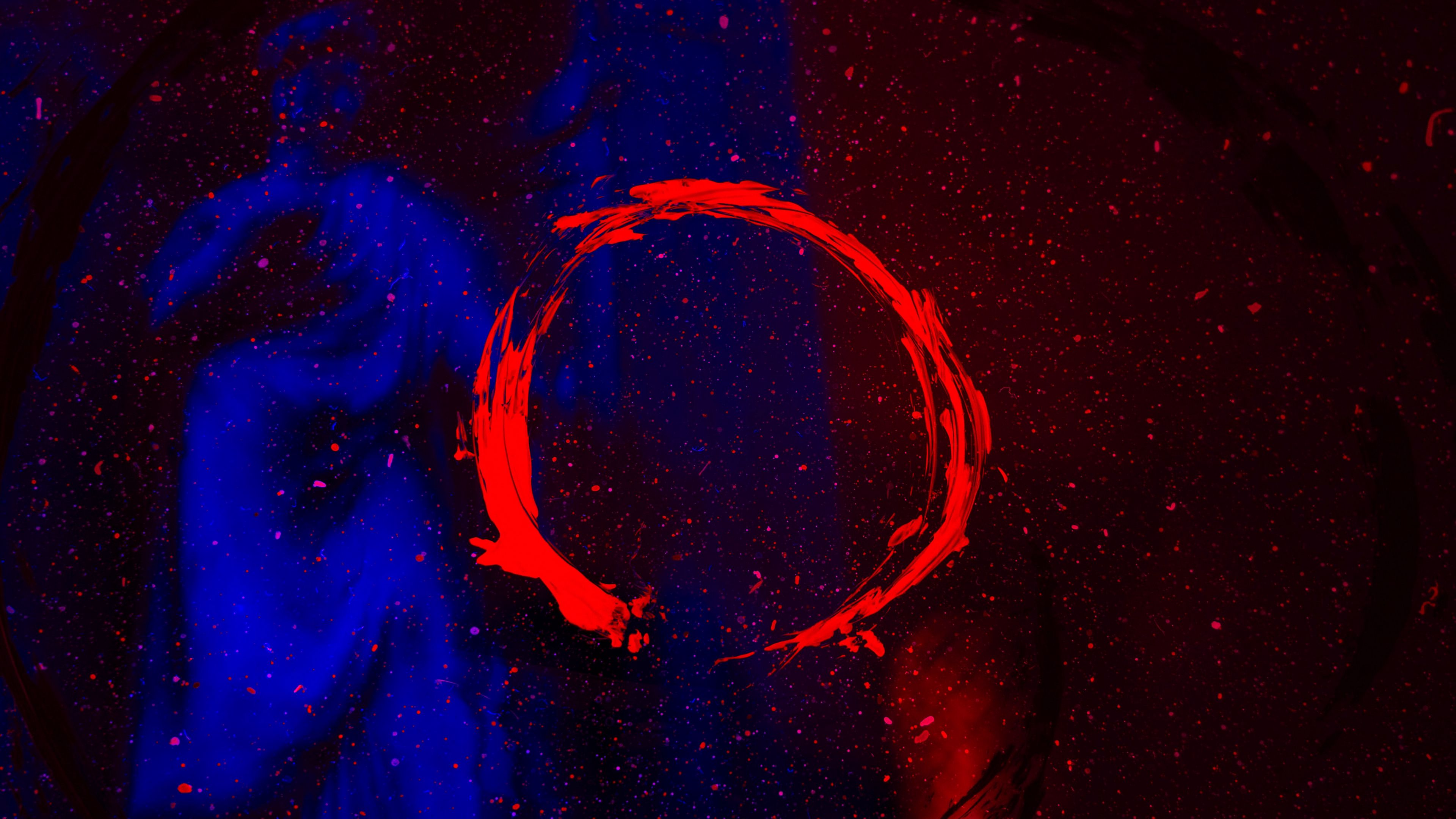 Description: A red circle is in the middle of a blue circle with a red circle on it's side.