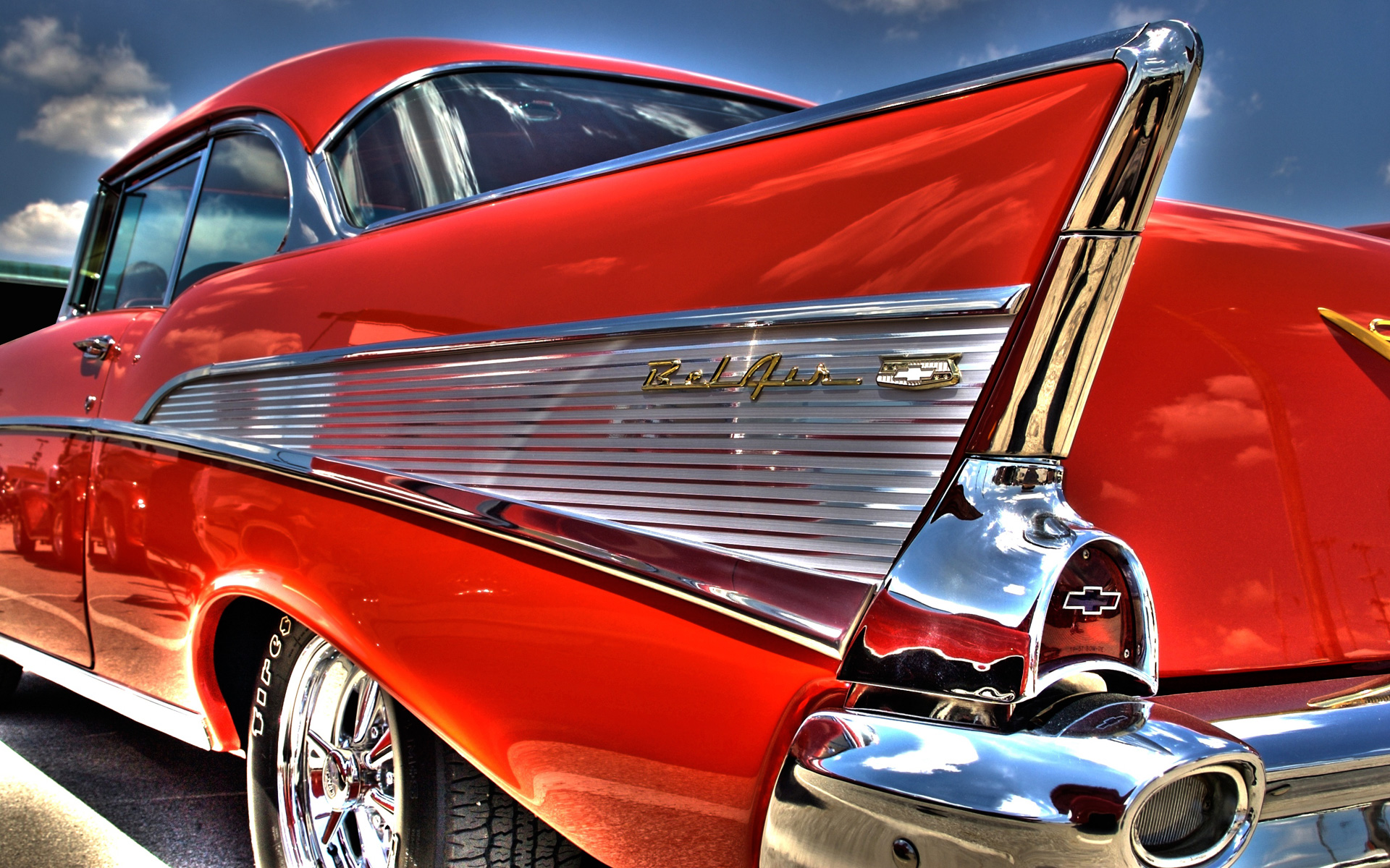 Description: A red classic car parked on the side of the road with its hood up and the hood up showing.