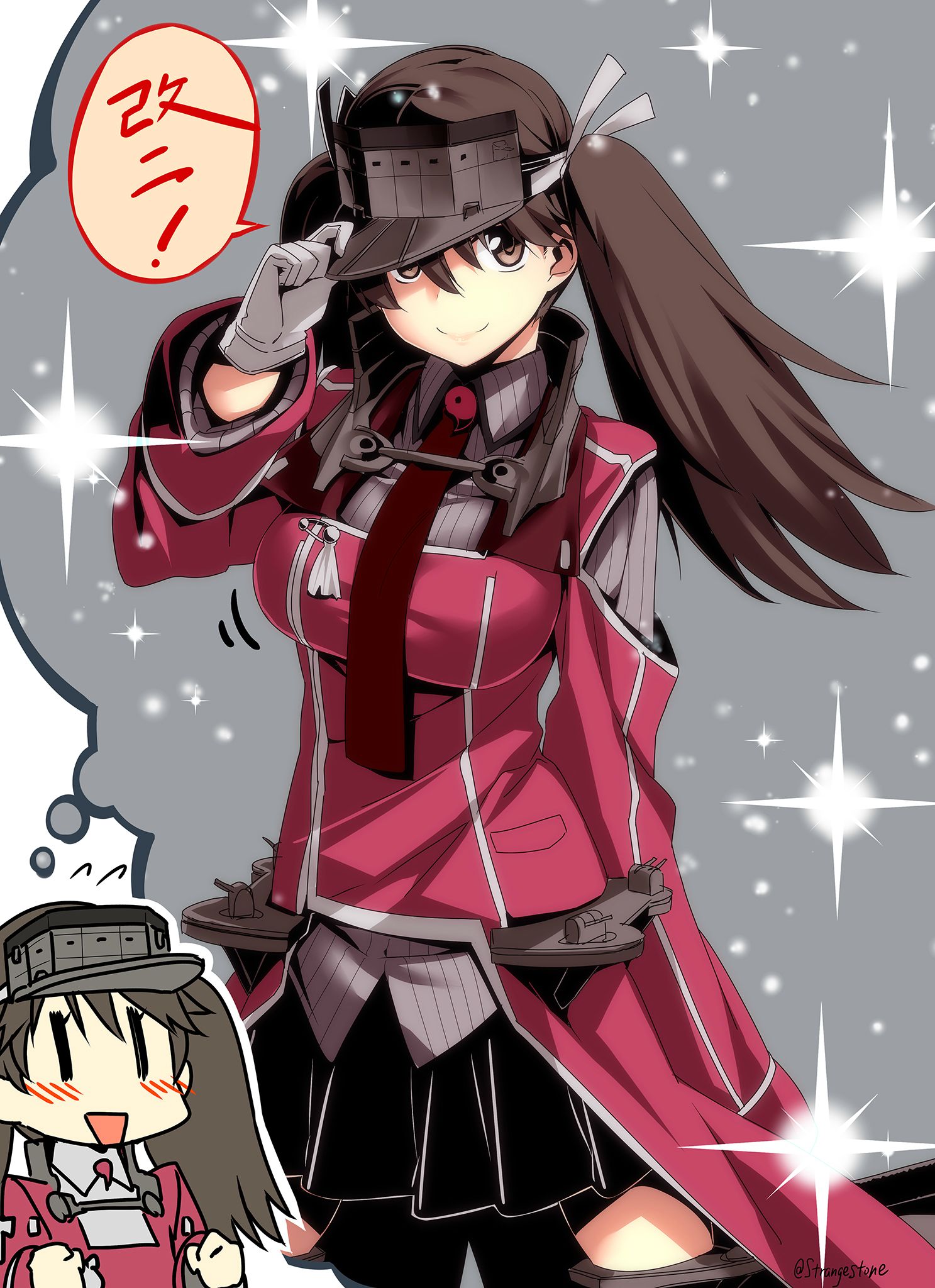Description: A woman in a red coat and black skirt holding a red umbrella and a red hat with a red and white sign.