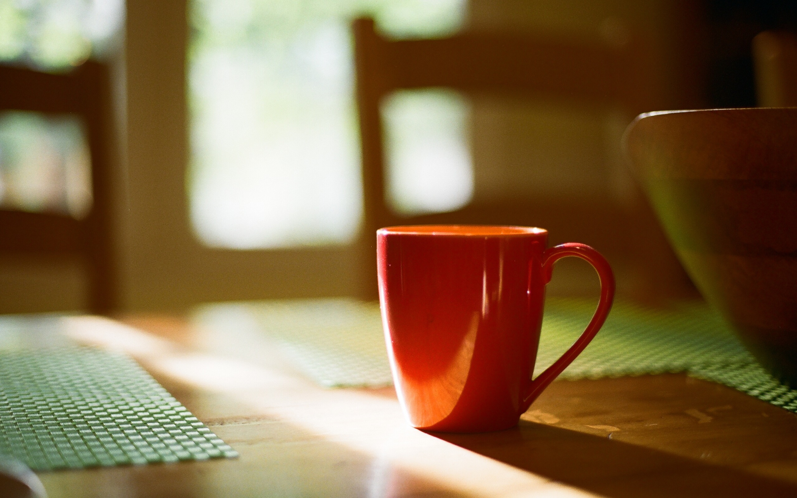 Description: A red coffee cup sitting on top of a table next to a bowl of food and a green mat.
