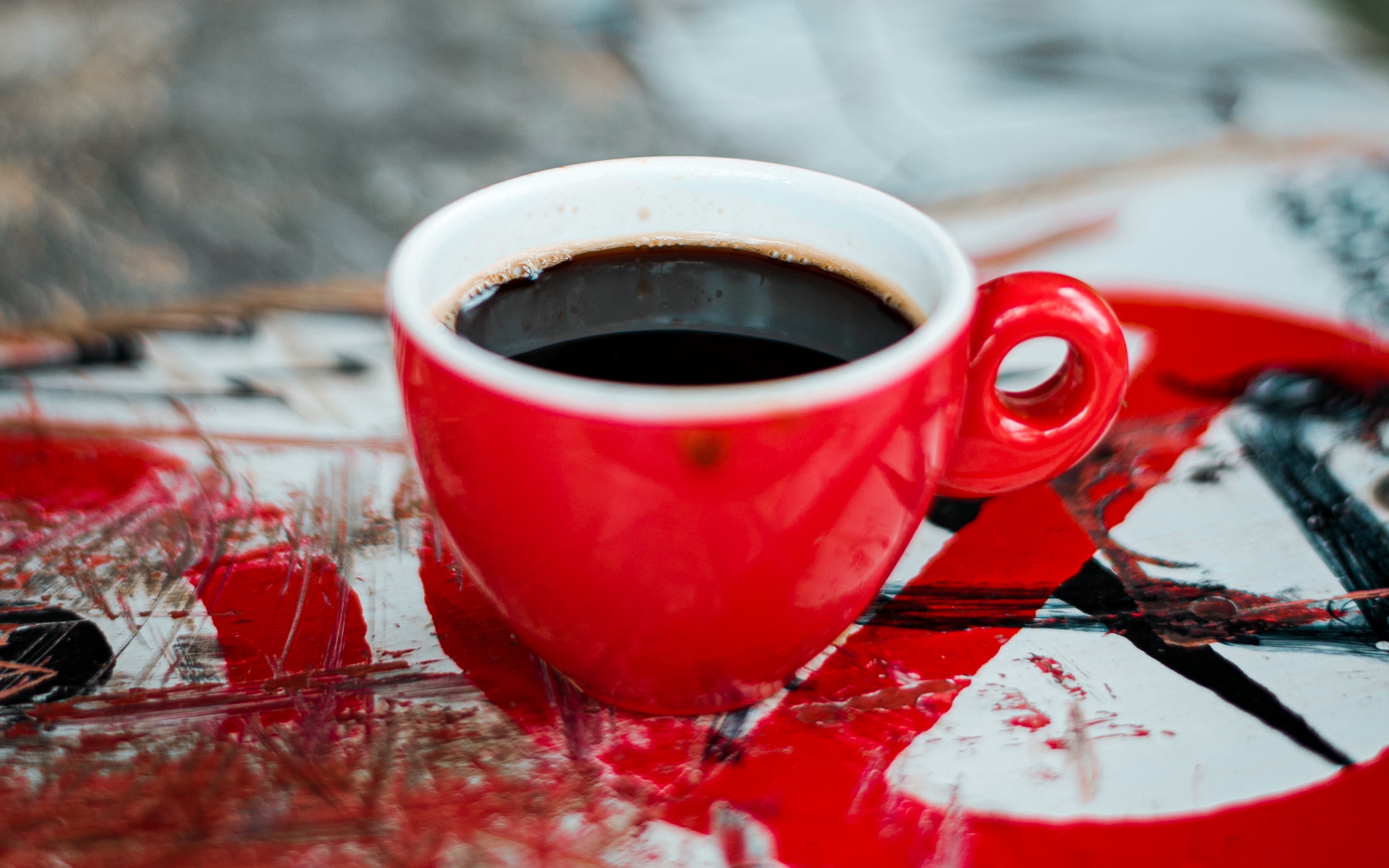 Description: A red cup of coffee sitting on top of a red plate on a table top with a red and black design.
