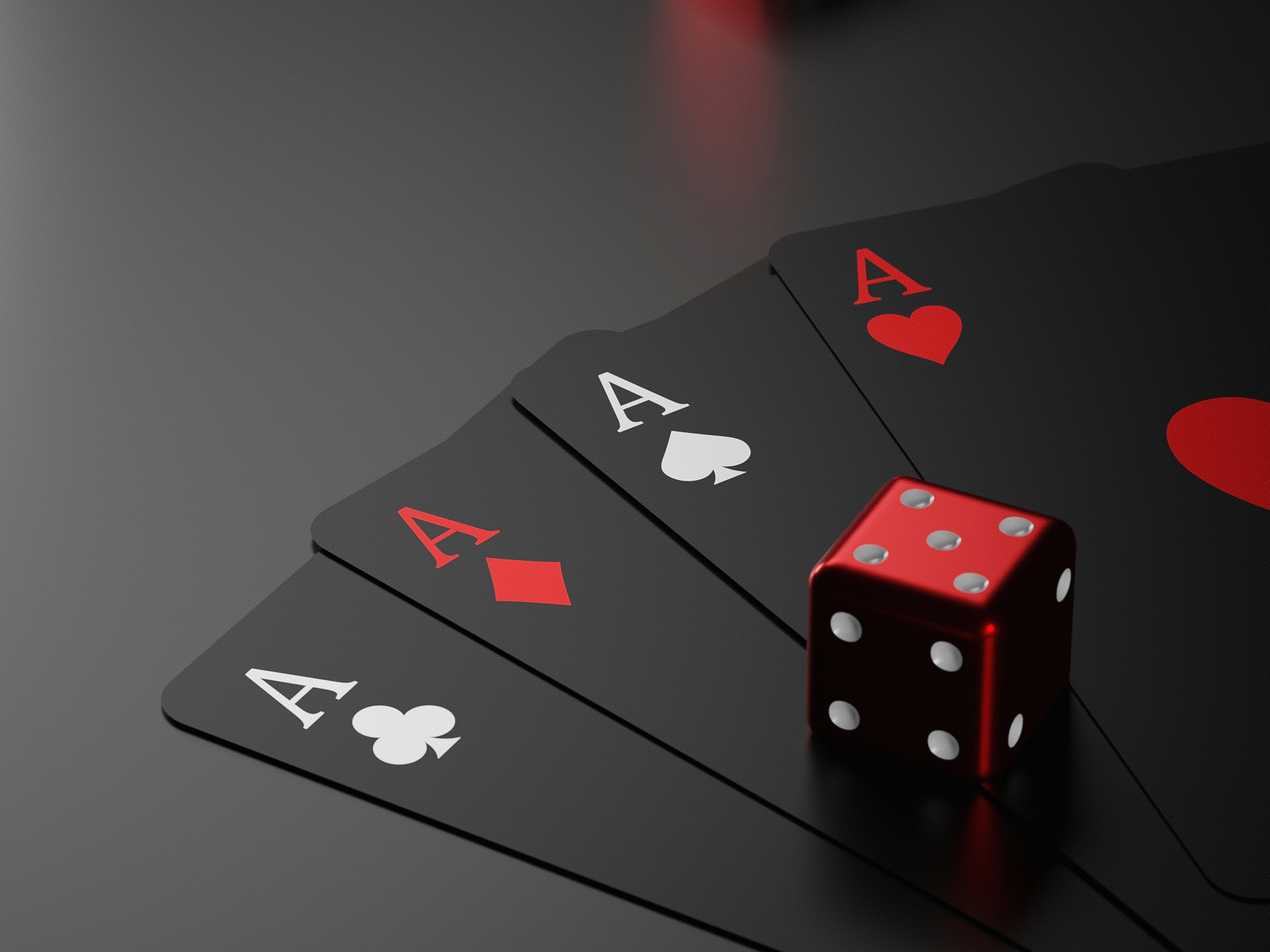 Description: A red dice and four playing cards on a table with a black background and red and white dices.