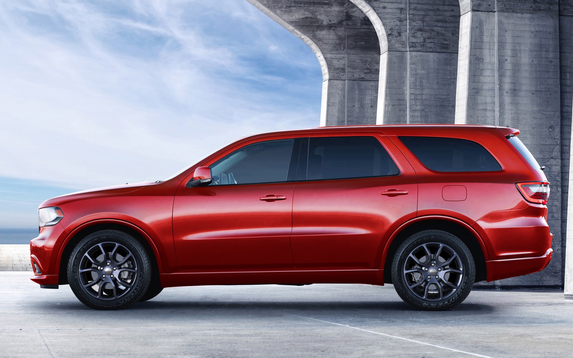 Description: A red dodge suv parked in front of a bridge with a sky background and a blue sky in the background.