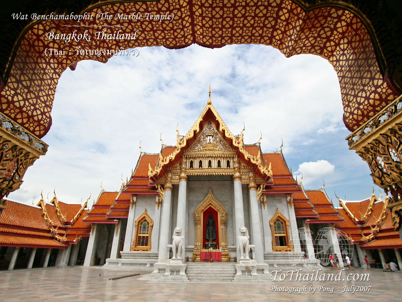 Description: A large building with a red door and a white and gold roof and a sky background with clouds in the sky.