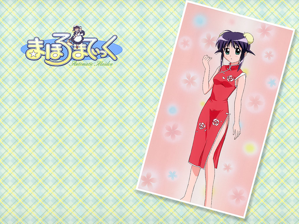 Description: A picture of a woman in a red dress with a cat on her head and a japanese character in the background.