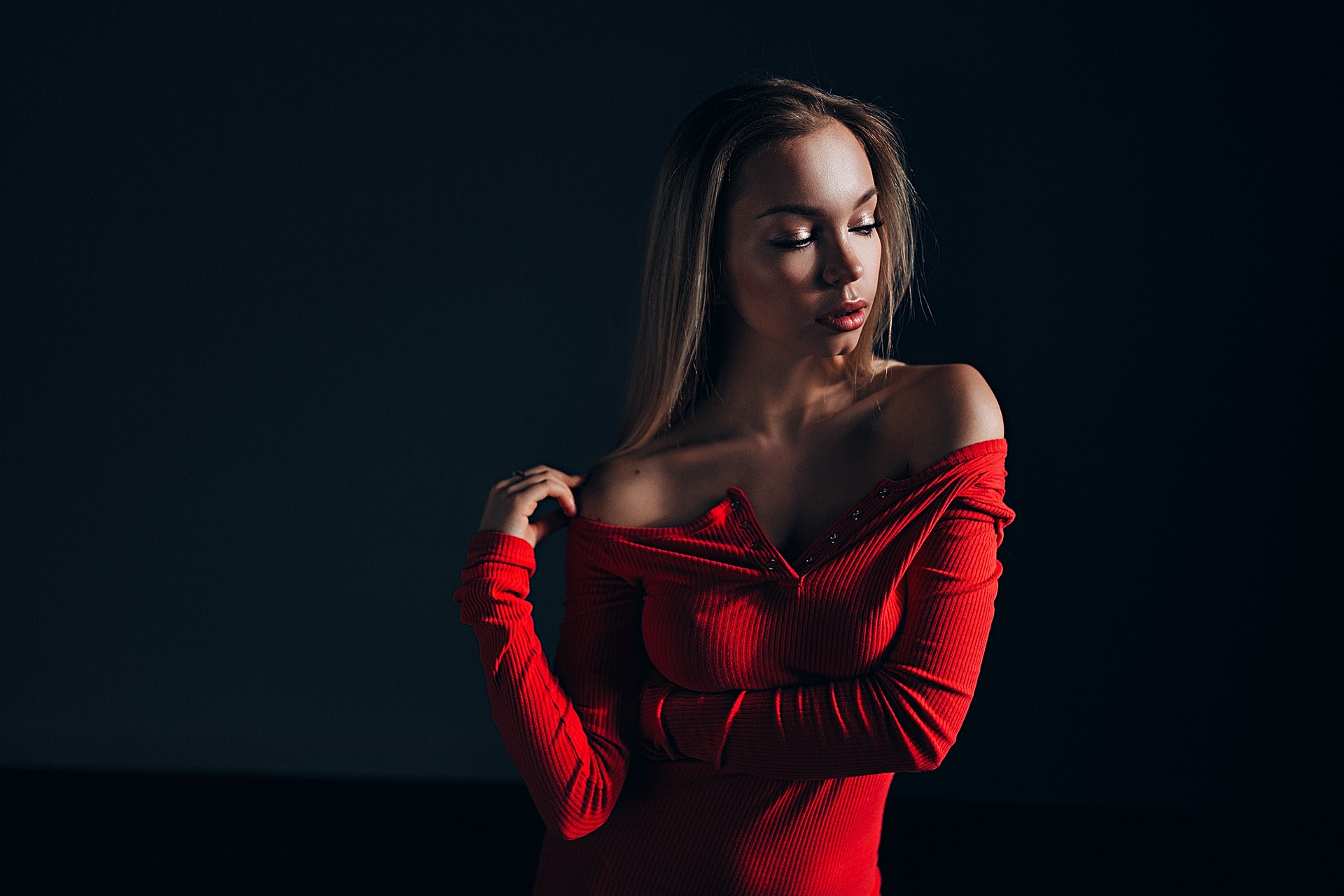 Description: A woman in a red dress posing for a picture with her hands on her hips and her right arm on her chest.