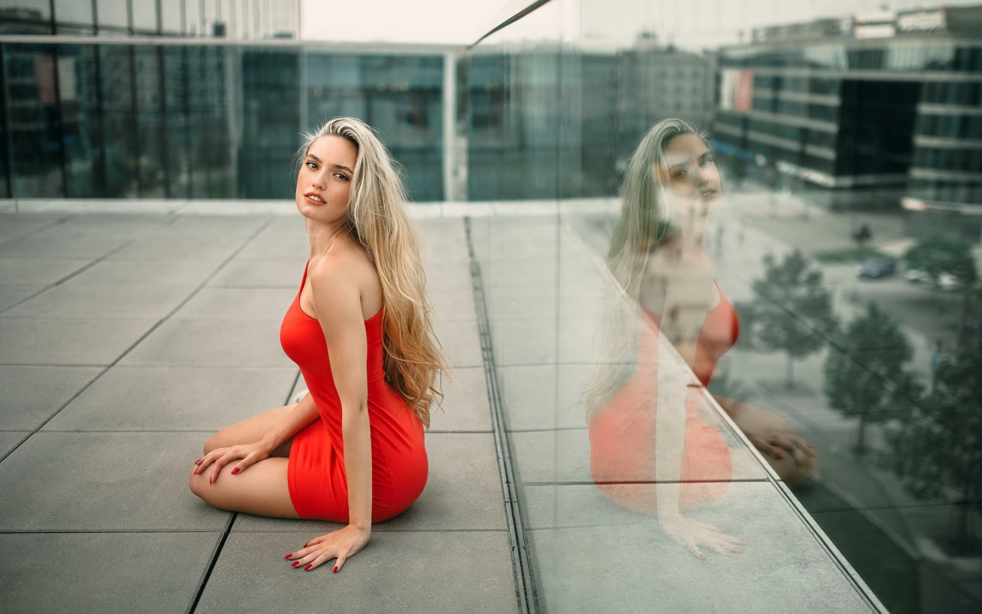 Description: A woman in a red dress sitting on a floor next to a window with a reflection of a woman in the window.