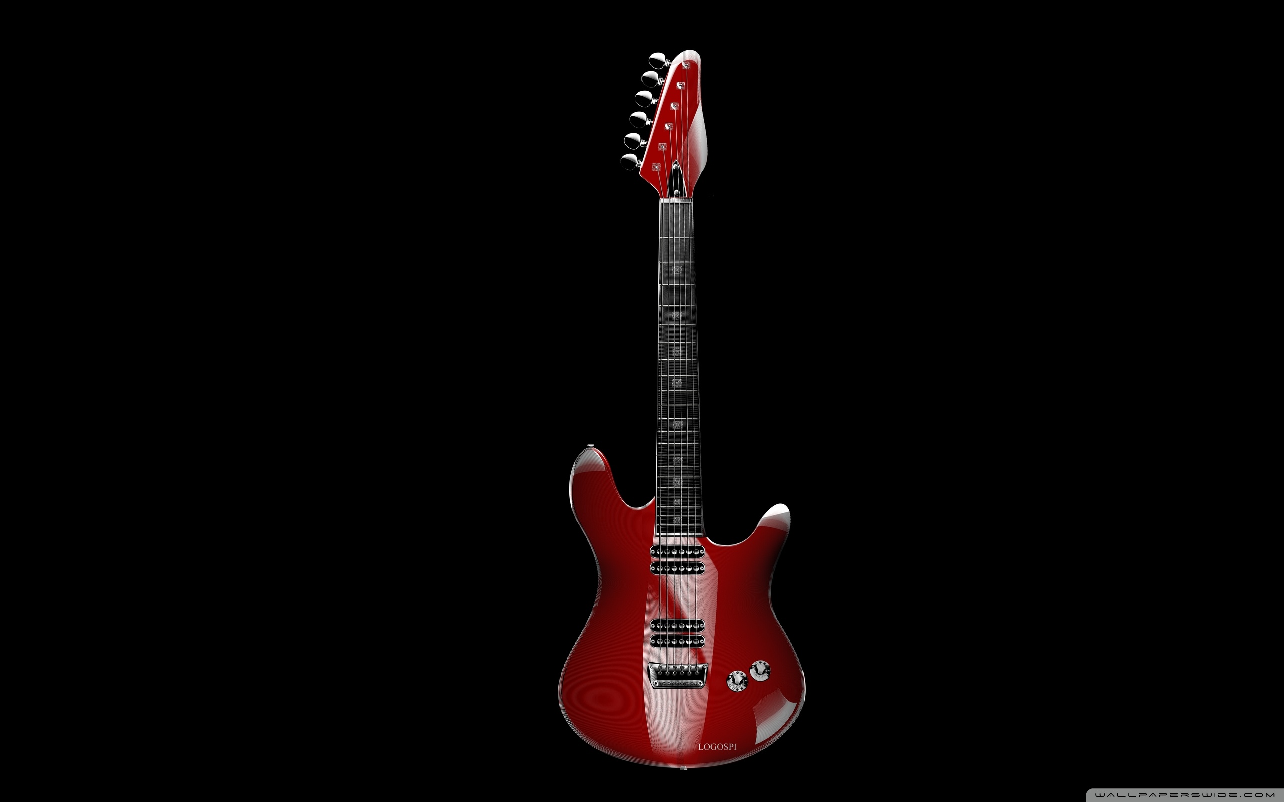 Description: A red electric guitar with a black background and a black background with a black background and a red electric guitar.