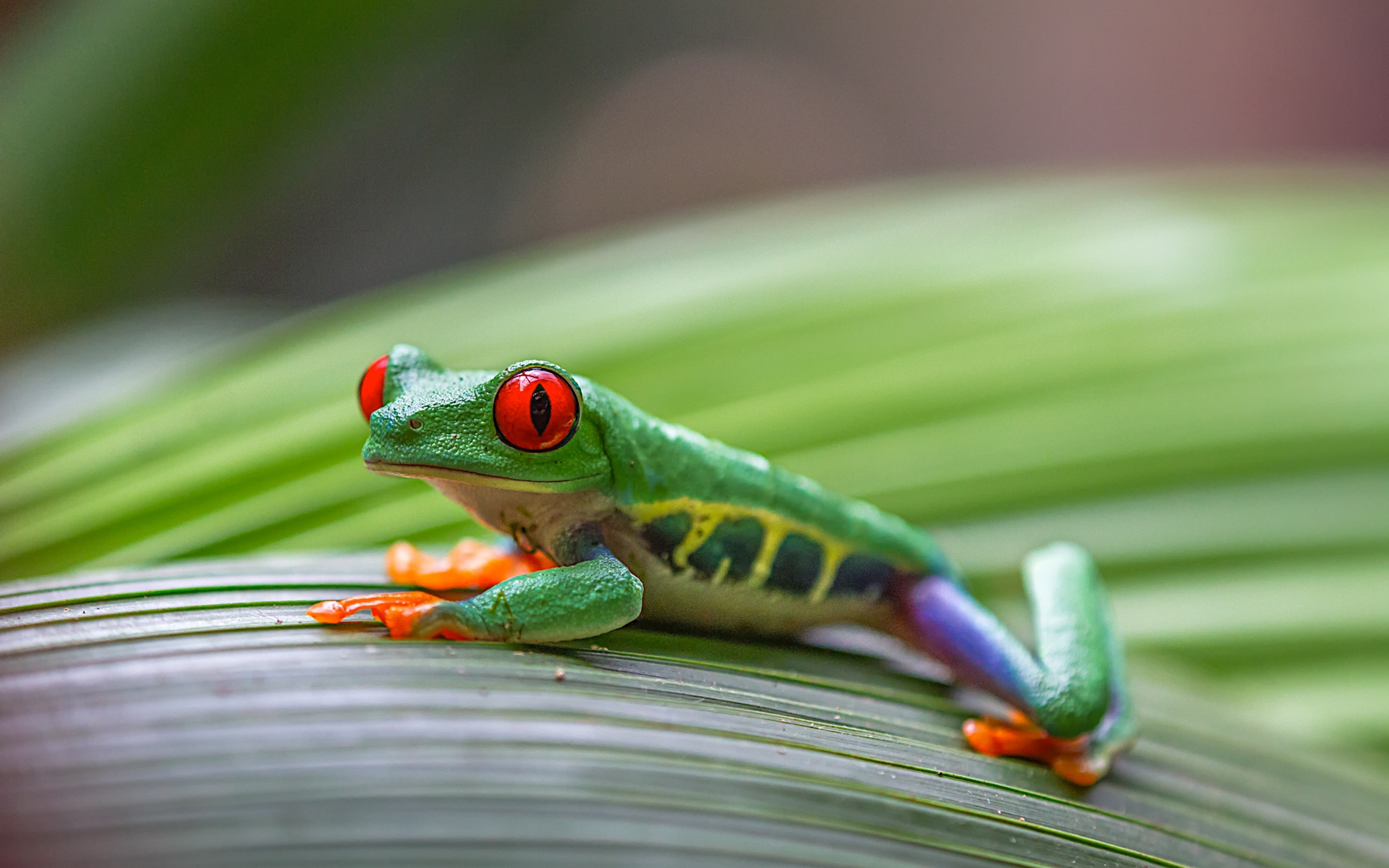 Description: A red eyed frog sitting on a leaf with its eyes open and a red - eyed frog on the top of it.