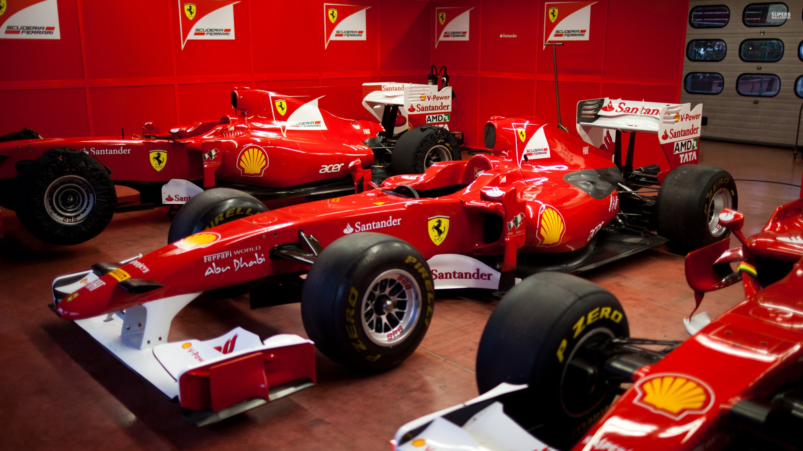 Description: A red ferrari car is parked in a garage with other cars behind it and a red wall behind it.