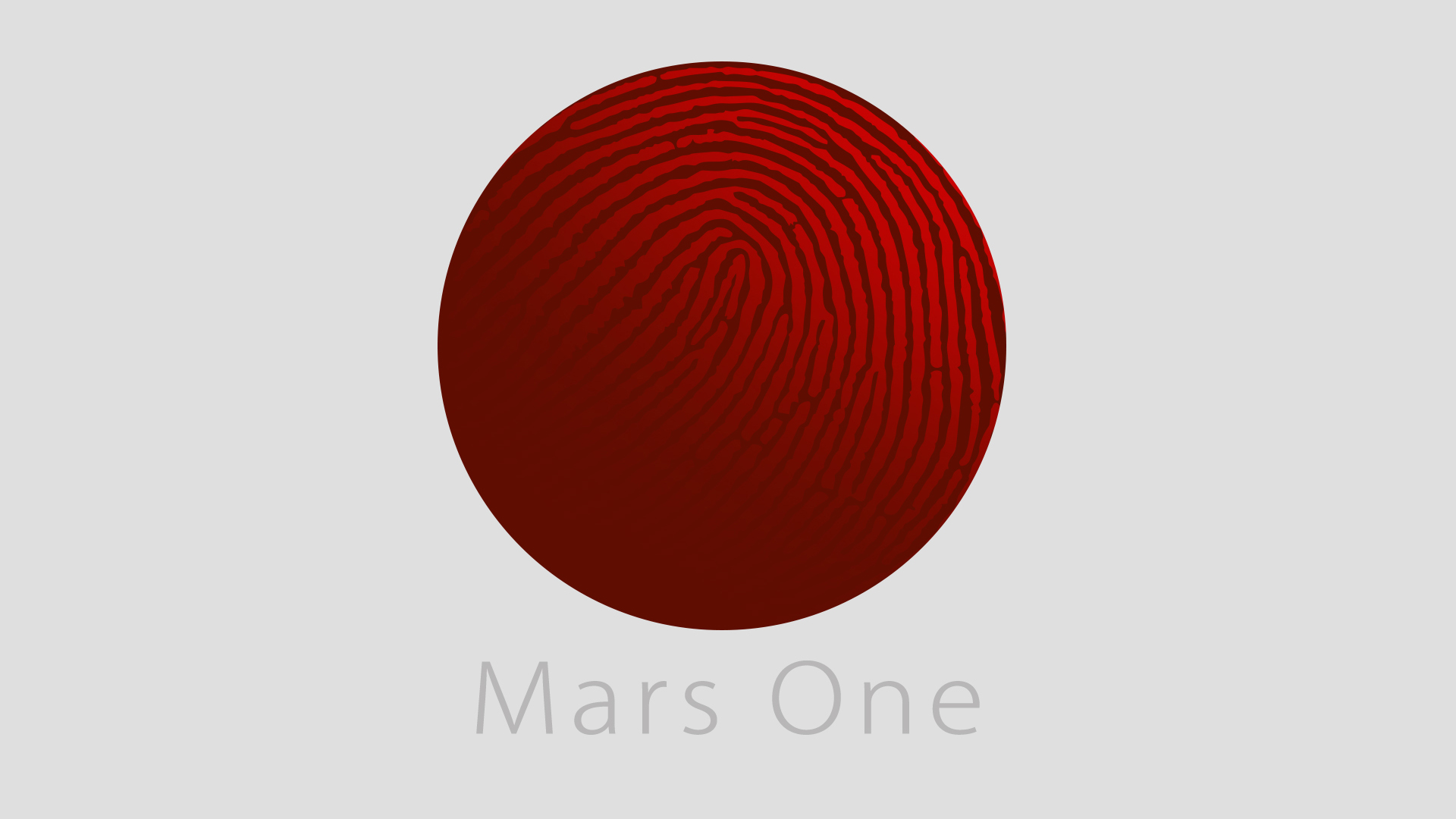 Description: A red fingerprint with the word mars one on it's side and a red circle with the word mars one on it's side.