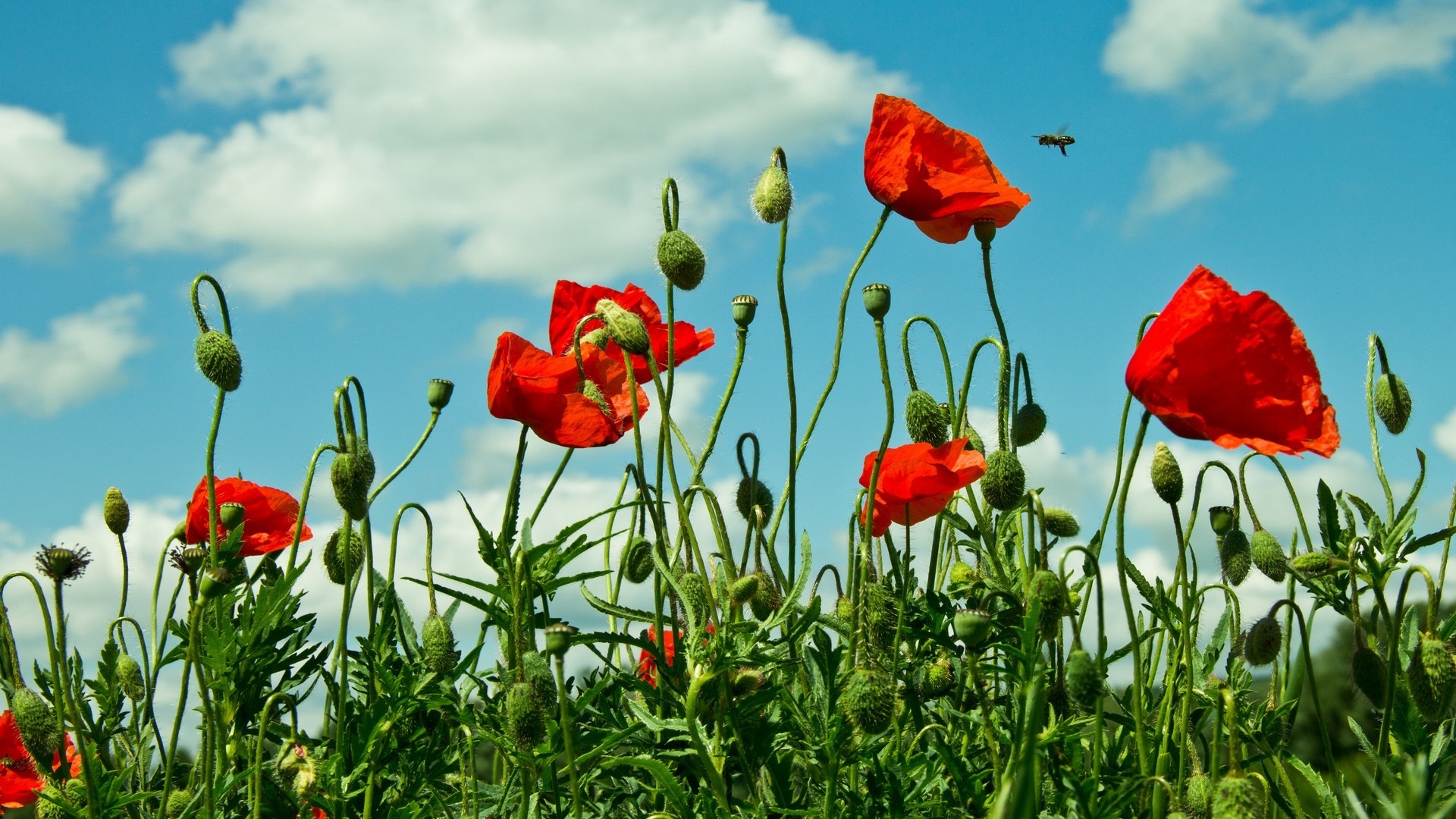 Description: A field of red flowers with a bee flying by in the background on a sunny day with a blue sky.