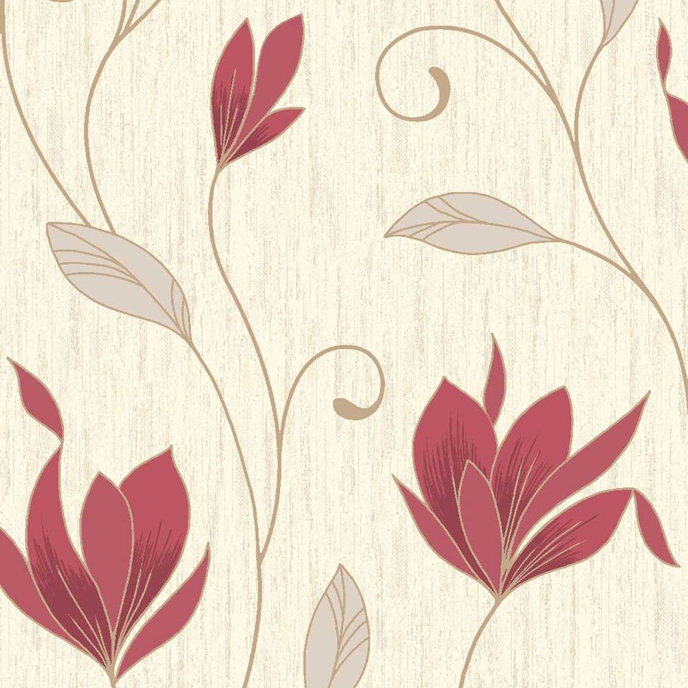 Description: A red flower on a beige background with a swirly design on it's side and a white background with a light brown border.