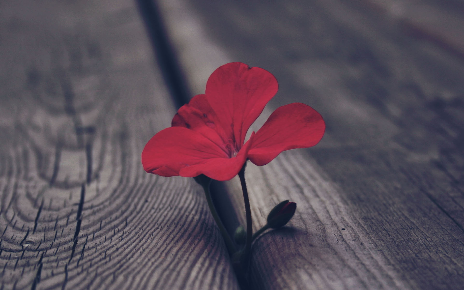 Description: A red flower is sitting on a wooden surface with a blurry background of wood planks and a planked surface.