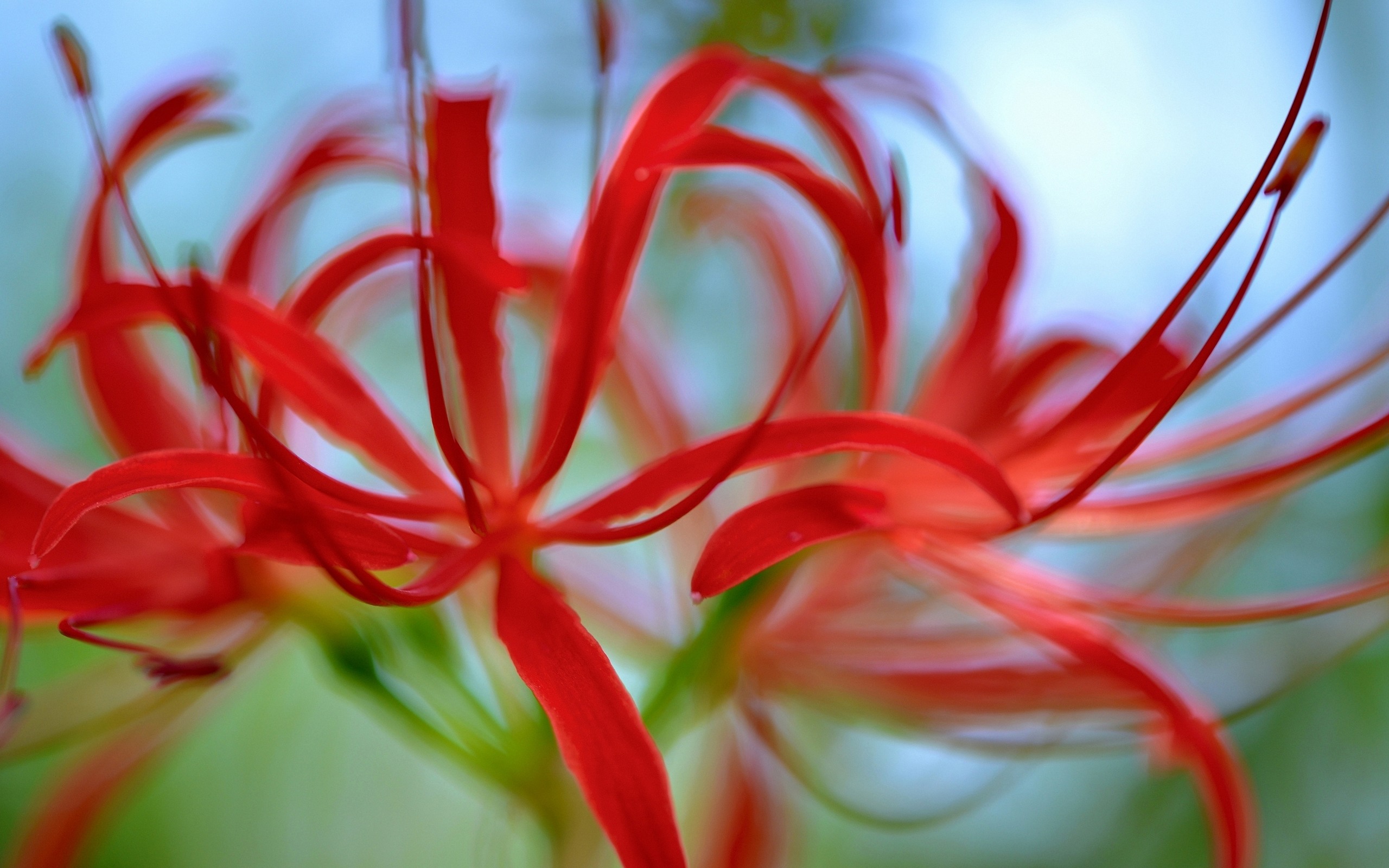 Description: A close up of a red flower with blurry background and a blurry background behind it is a blurry image of a flower.