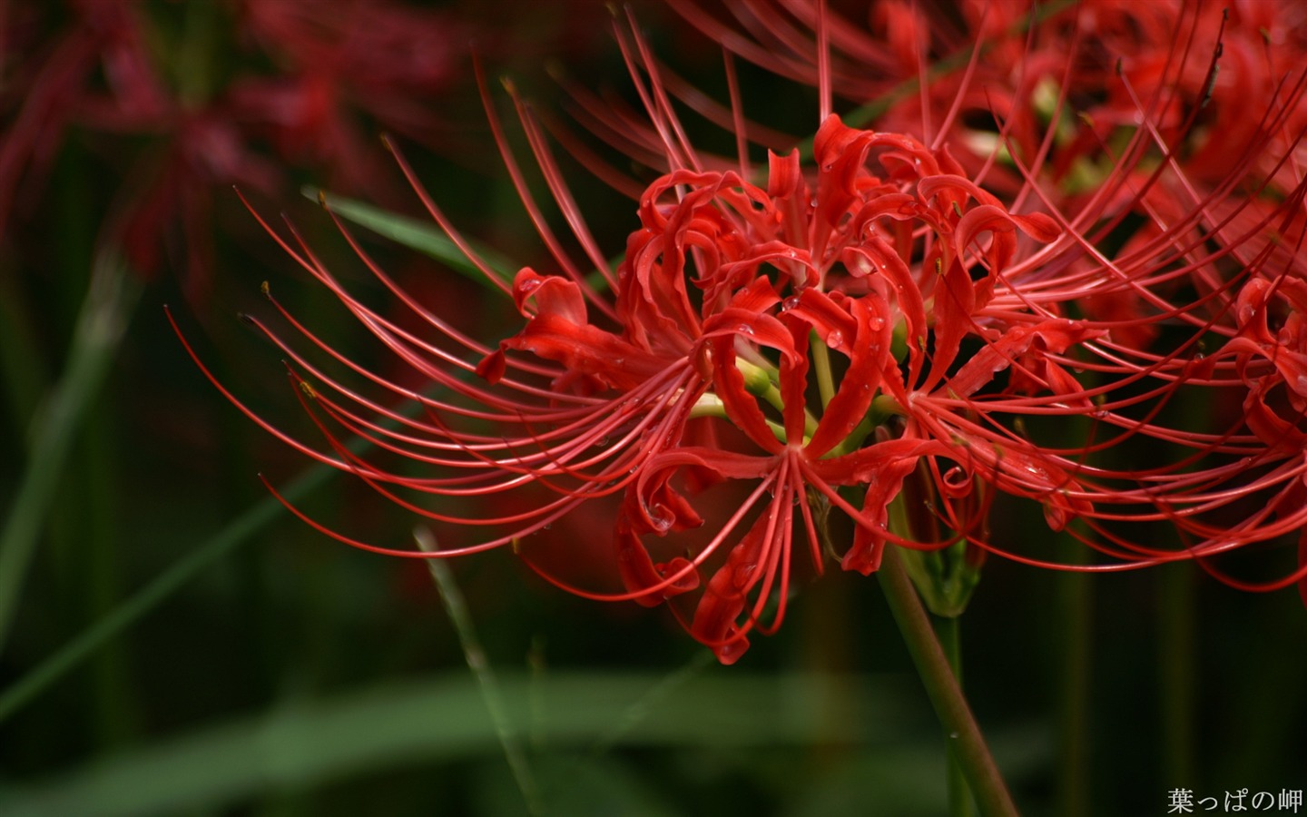 Description: A close up of a red flower with long stems and a green background with a blurry image of the flower.