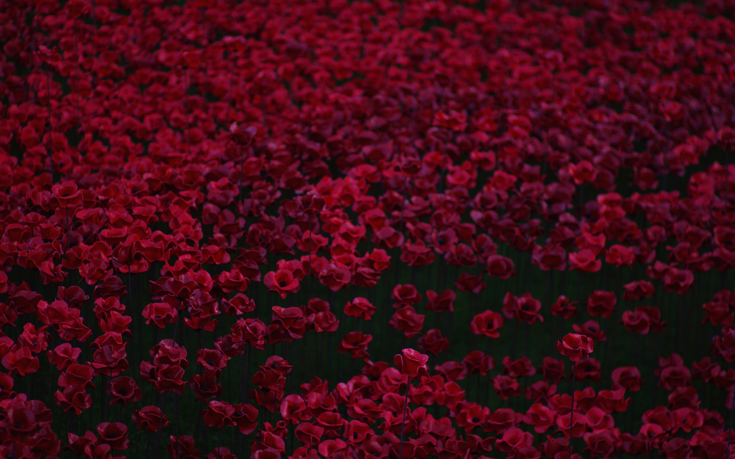 Description: A field of red flowers with a black background and a red umbrella in the middle of the field with a red umbrella.