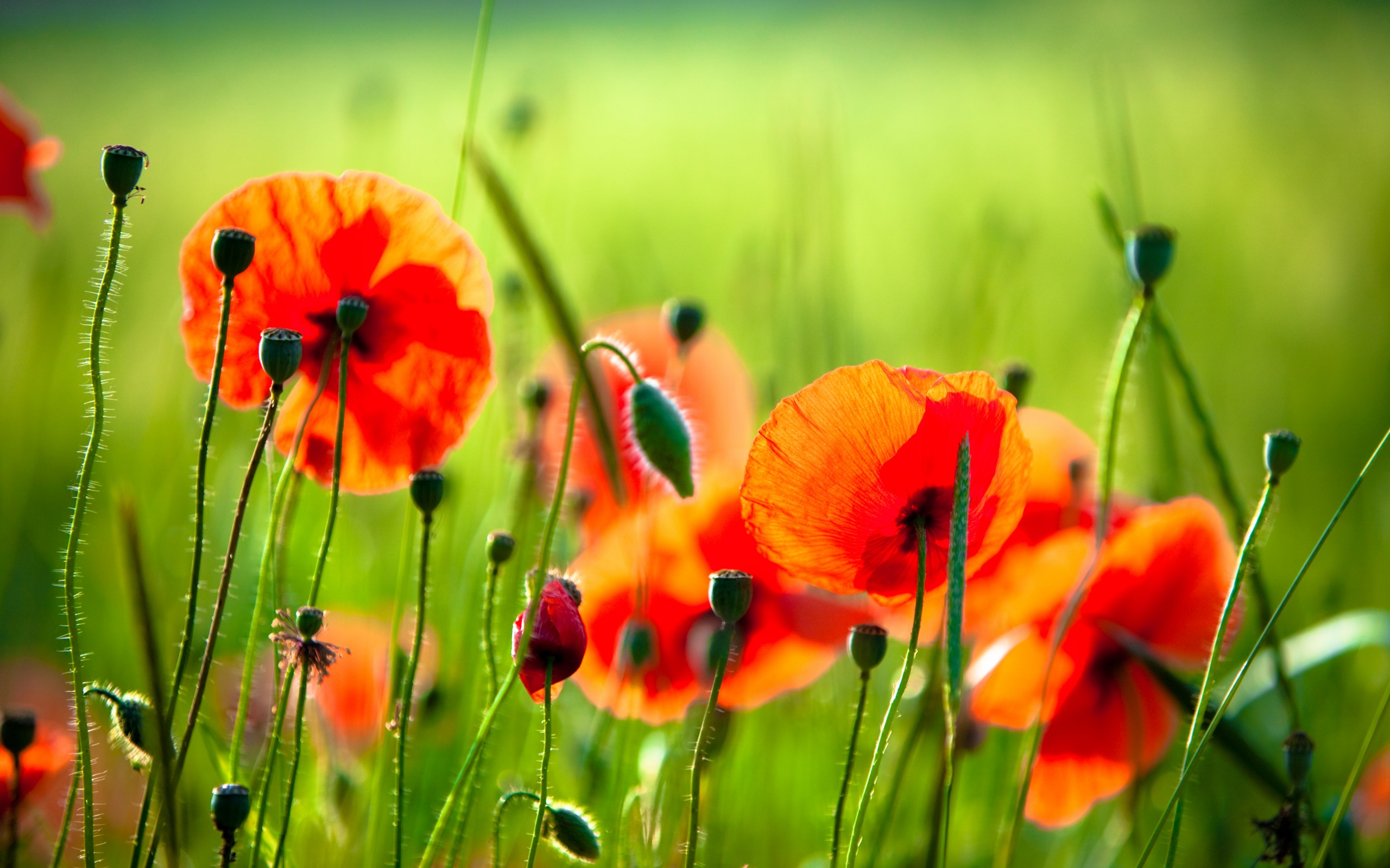 Description: A field of red flowers with green grass in the background and a blurry background of the grass is very green.