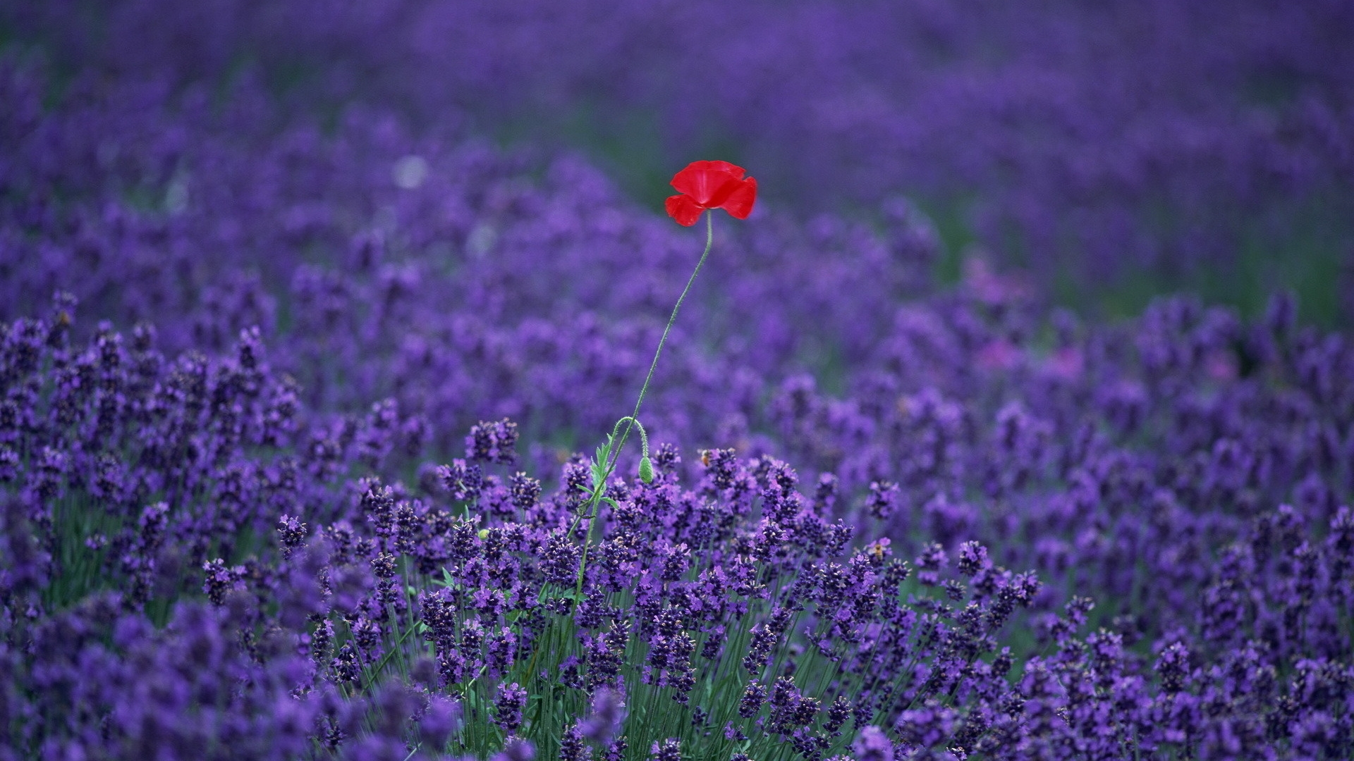Description: A lone red flower in a field of lavender flowers in the springtime with a purple sky in the background.