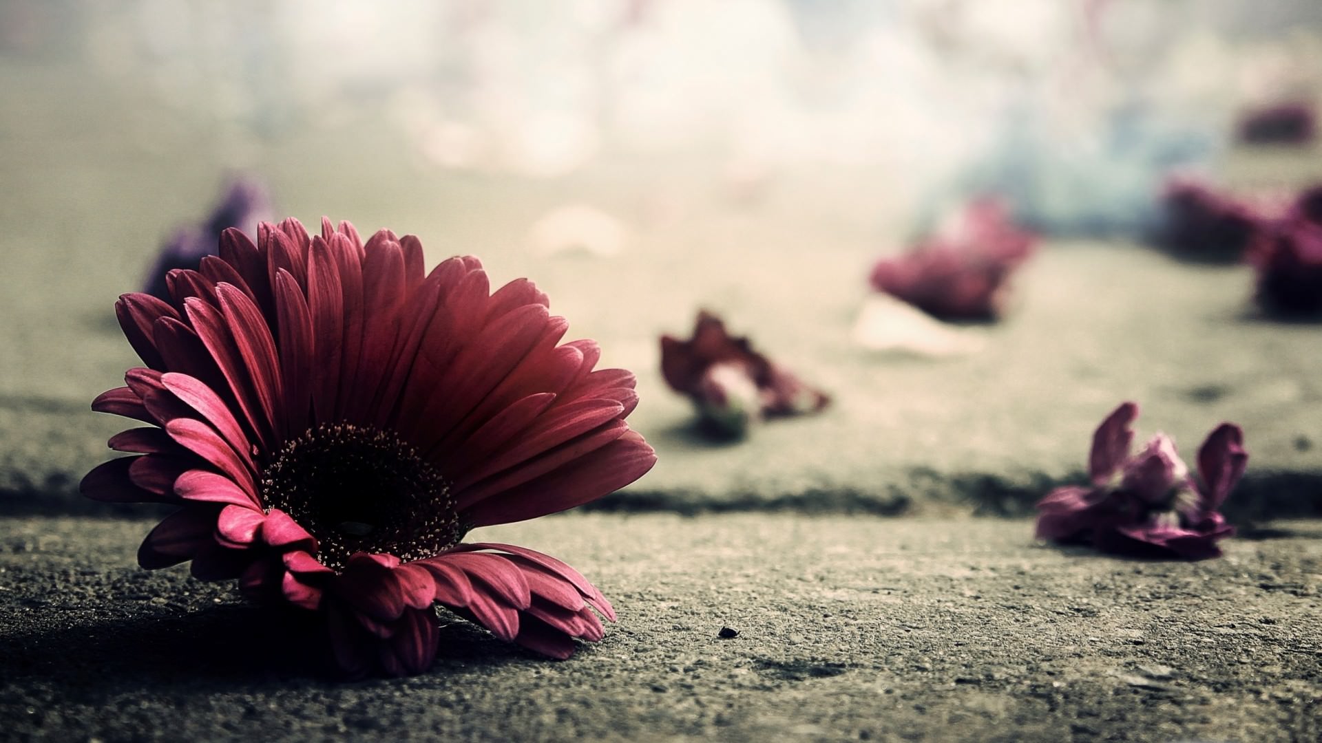Description: A red flower sitting on the ground next to a bunch of petals on the ground with a blurry background.
