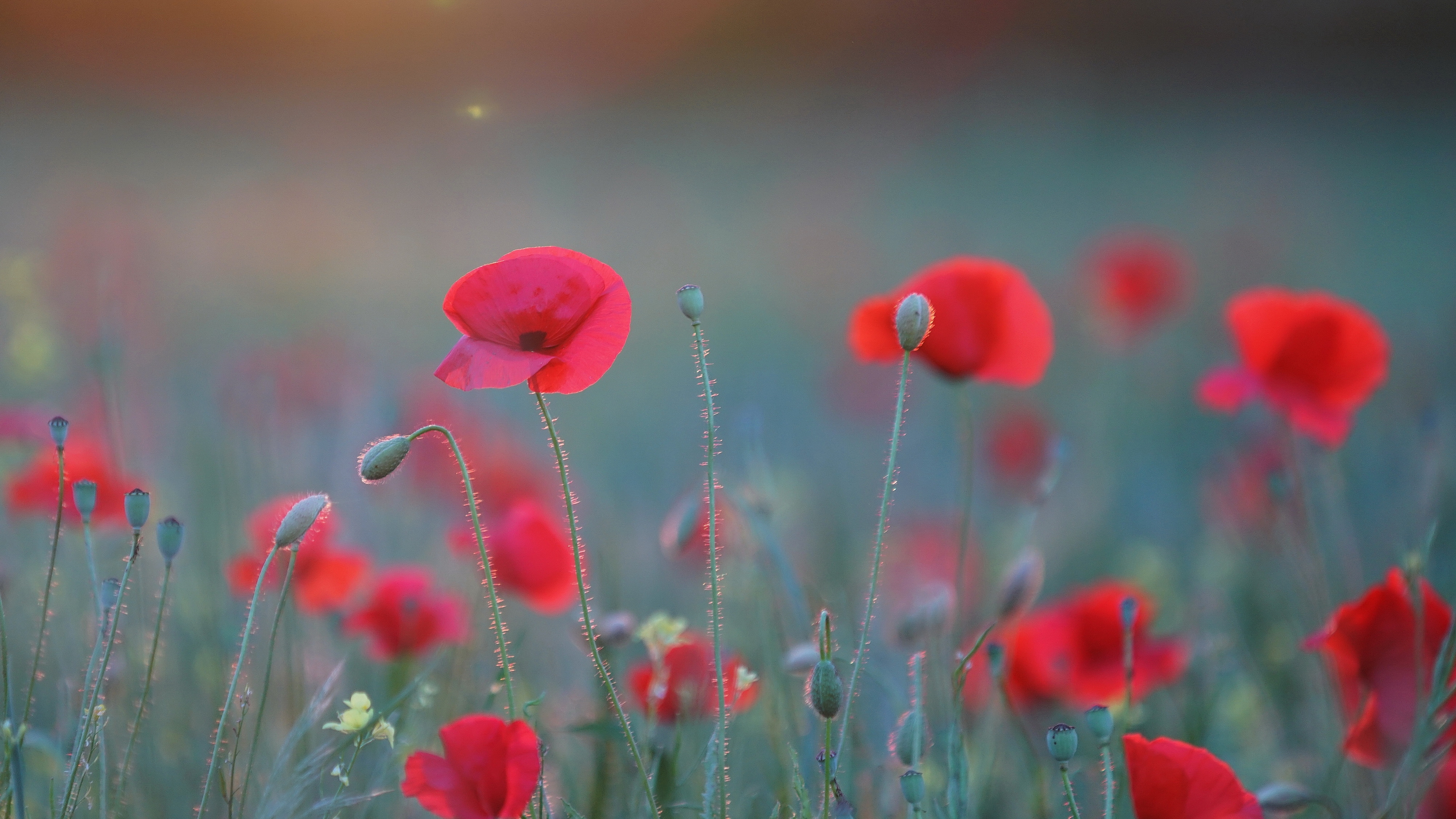 Description: A field of red flowers with a blurry background of grass and flowers in the foreground.