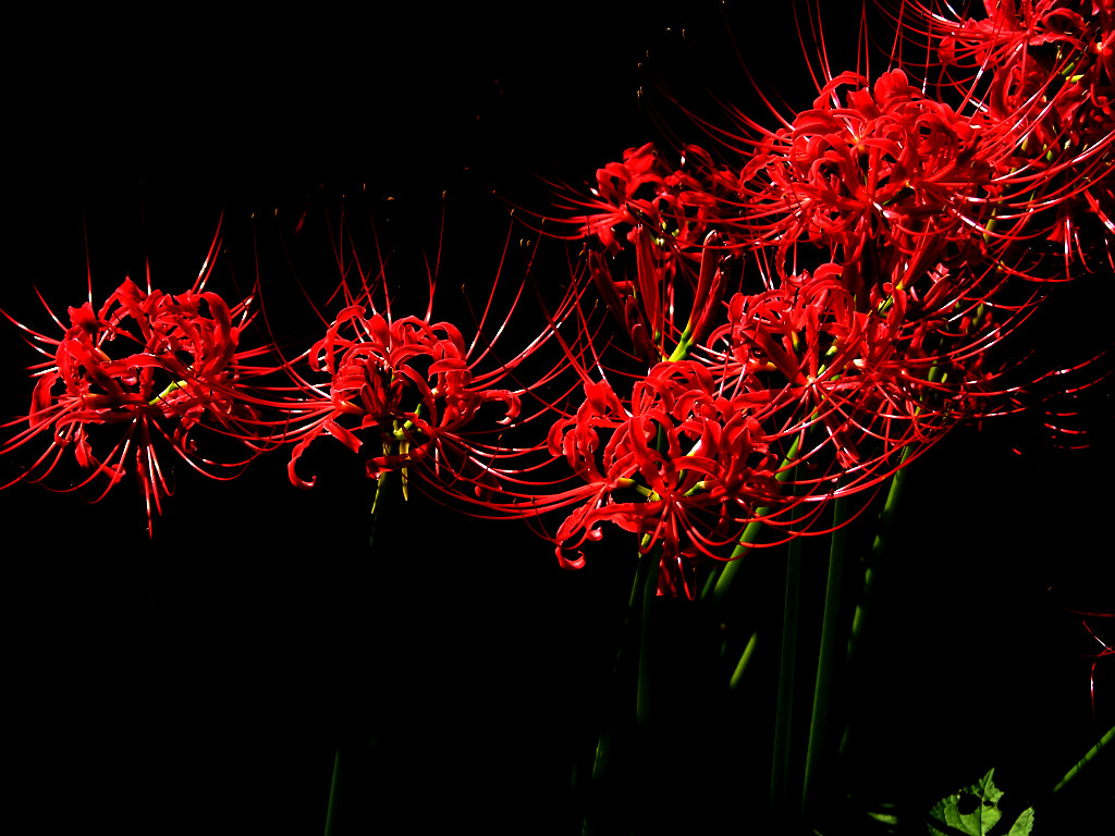 Description: A bunch of red flowers are in a vase on a table with a black background and a black background.
