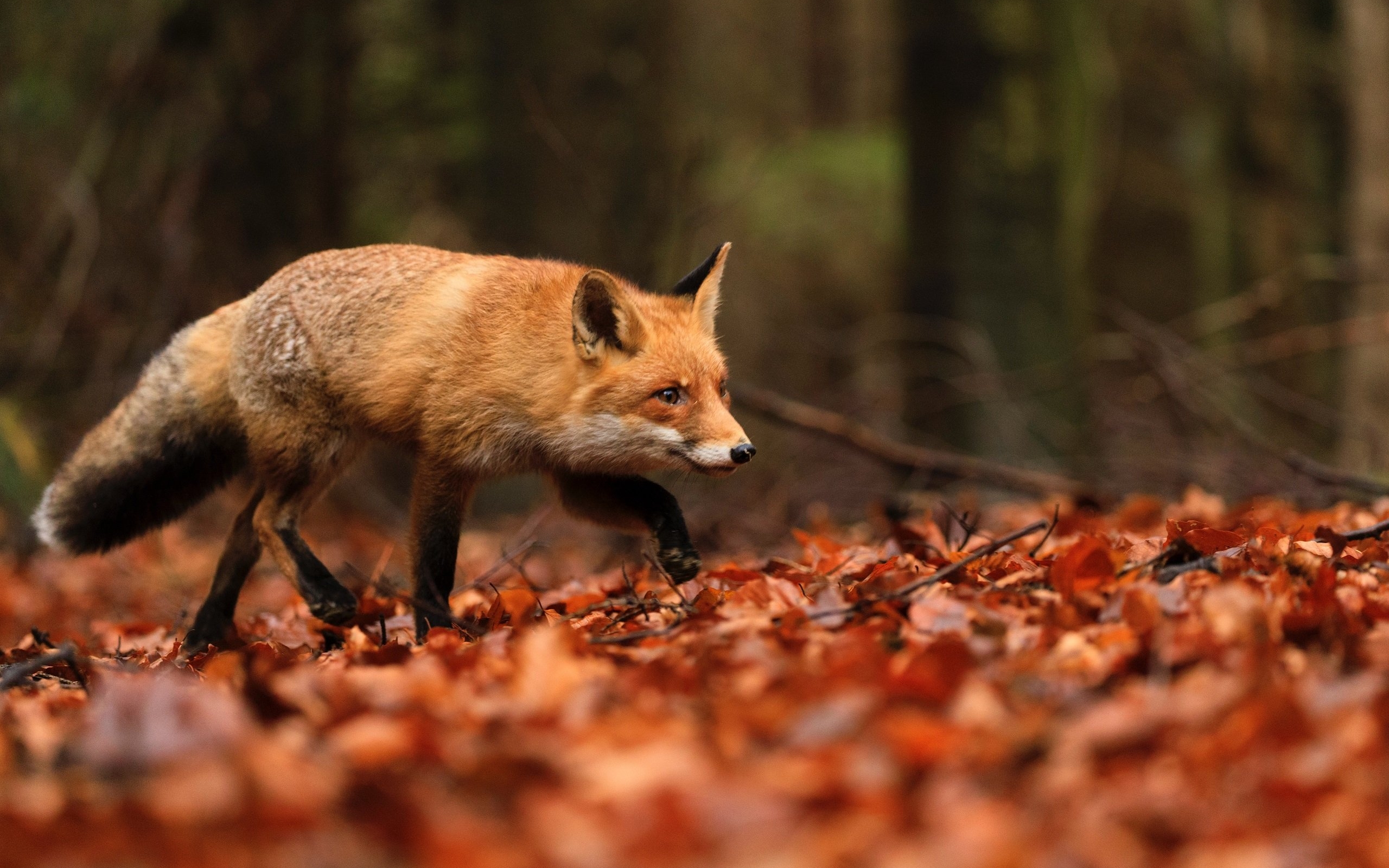 Description: A red fox walking through a forest filled with leaves and trees in autumn time.