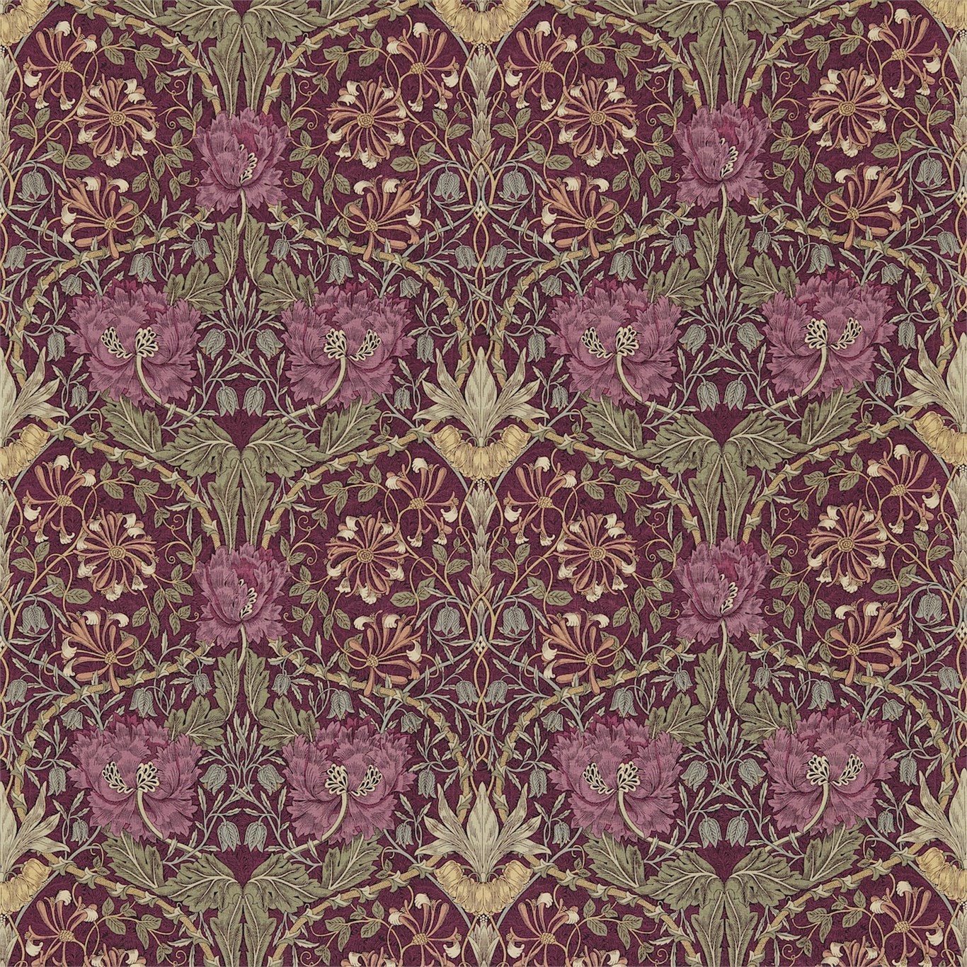 Description: A red and green floral pattern with leaves and flowers on a red background with a gold border and a gold border.