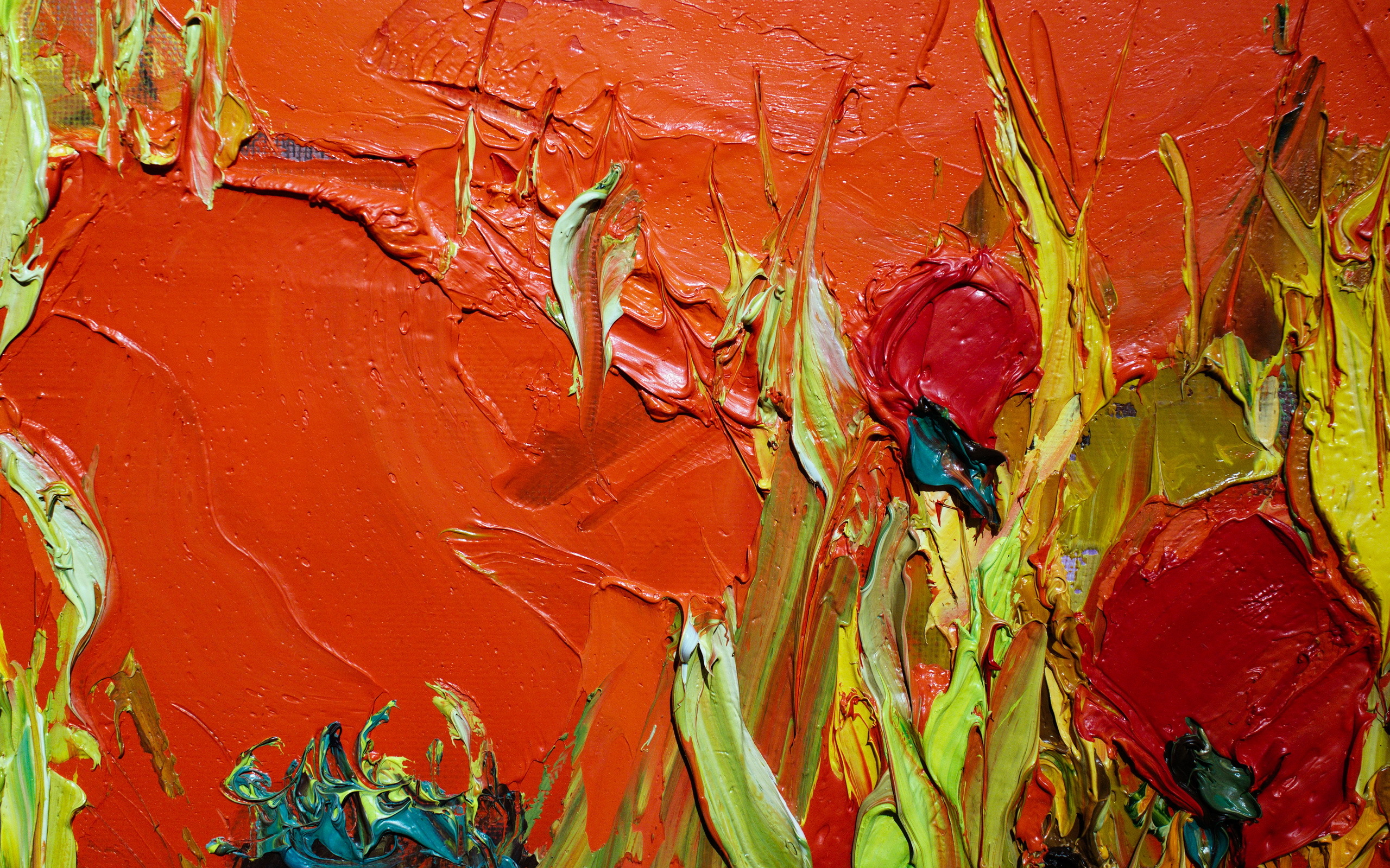 Description: A painting of red and green flowers on a red background with a blue and green flower on the left side of the painting.