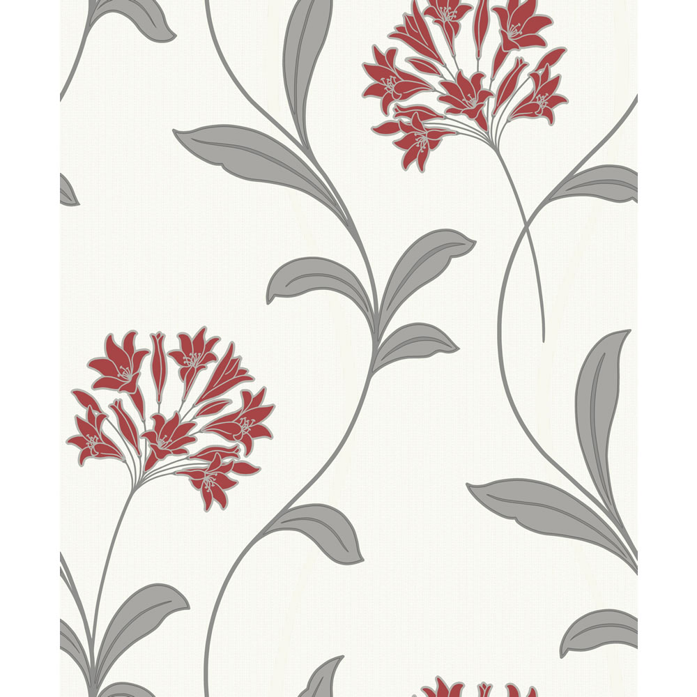 Description: A red and grey floral wallpaper with leaves and flowers on it's side.