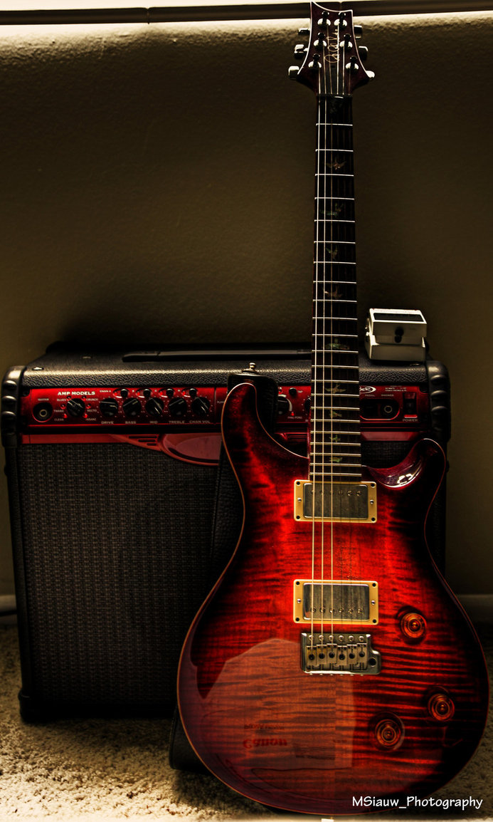 Description: A red guitar sitting next to a amp on a counter top next to a wall and a guitar case.