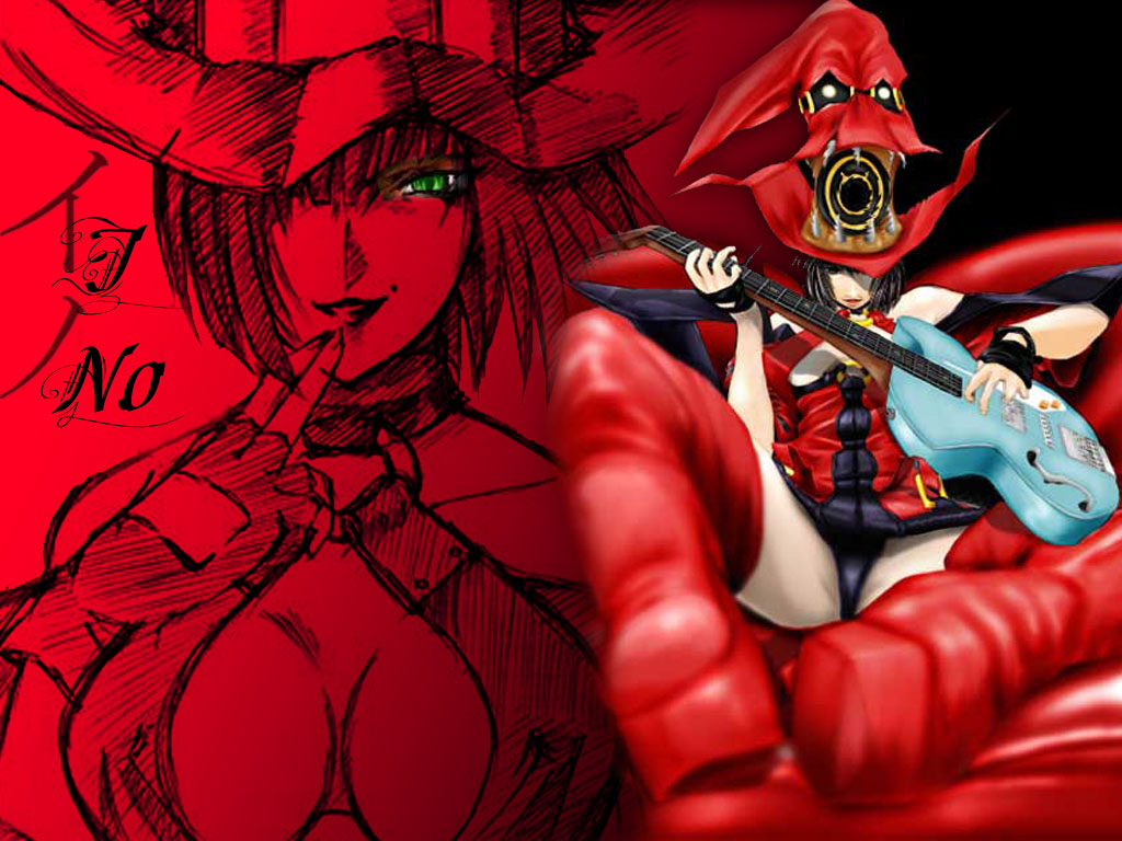 Description: A woman in a red outfit holding a guitar and a red background with a drawing of a demon girl.