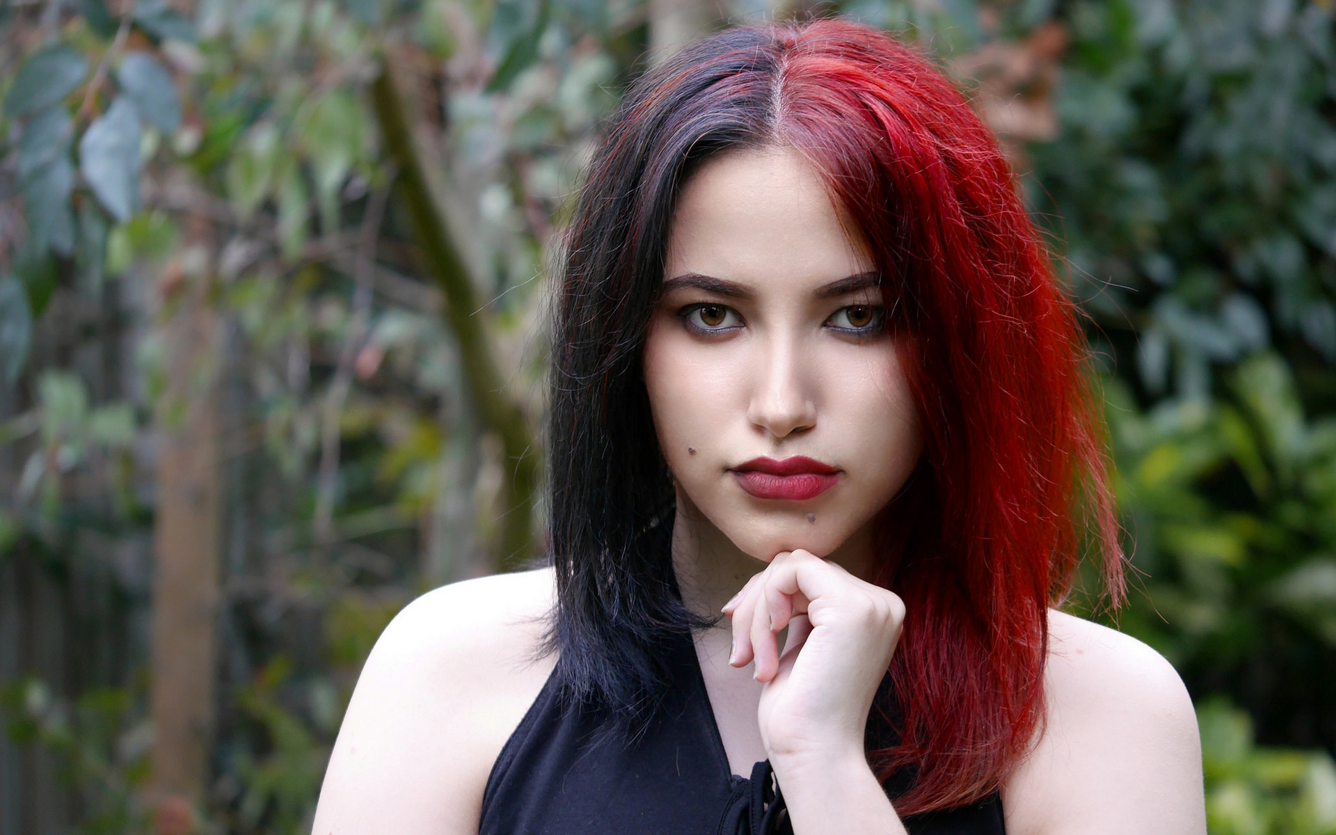 Description: A woman with red hair and a black top posing for a picture with her hand on her chin and her hand on her chin.