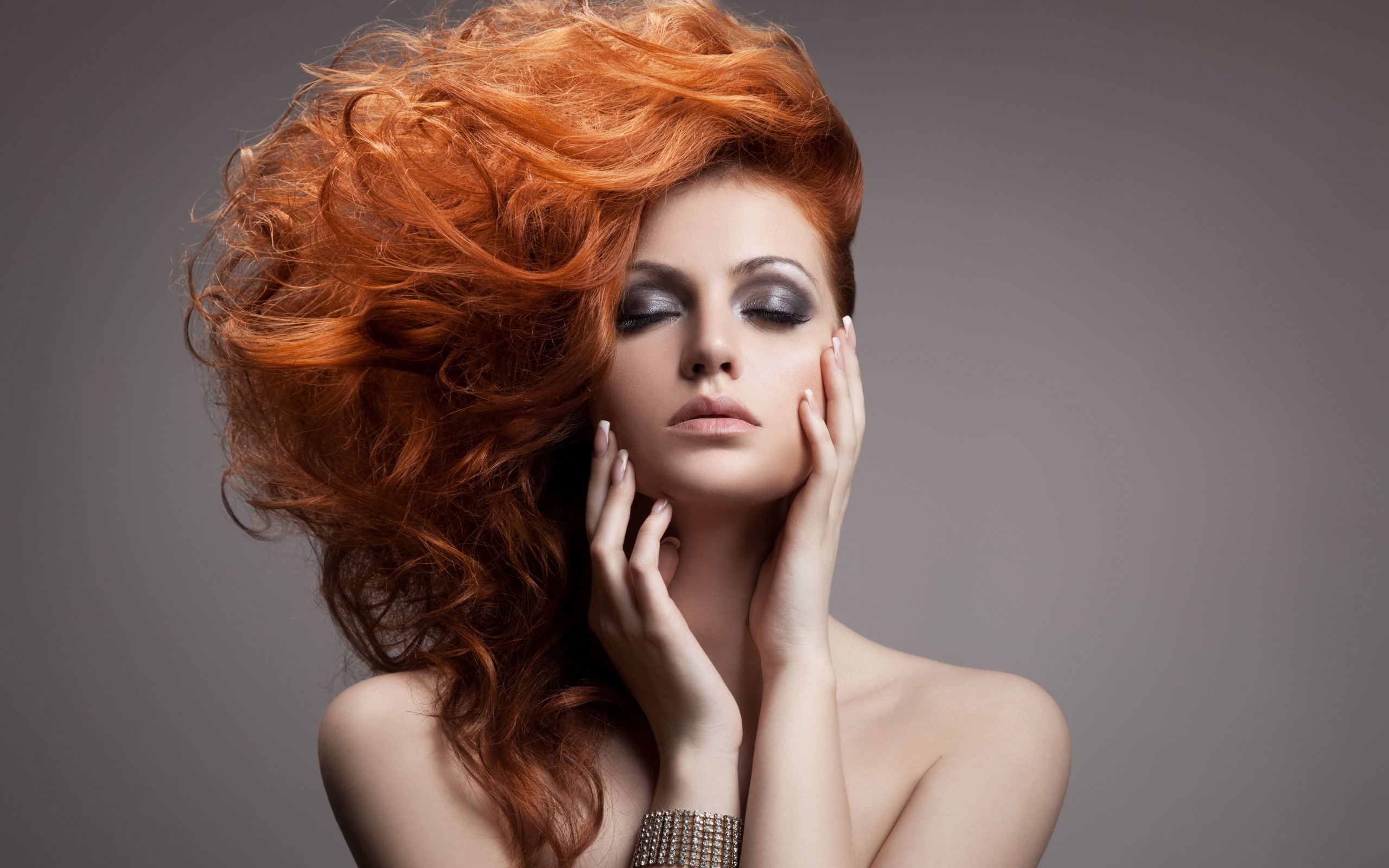 Description: A woman with red hair is posing for a picture with her hands on her face and her hair blowing in the wind.