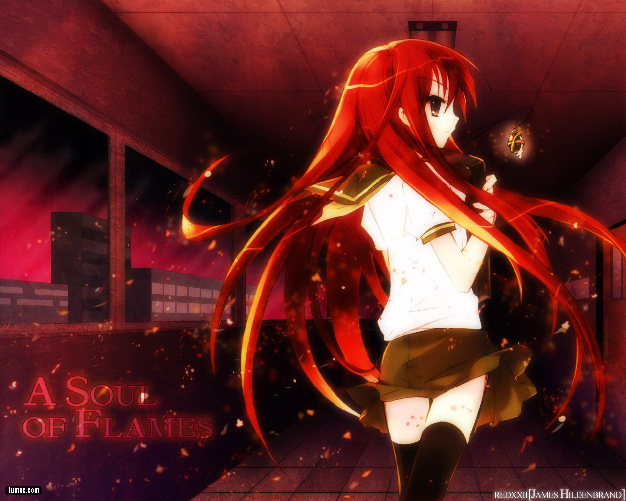 Description: A girl with long red hair and a white shirt is walking through a hallway with a ball in her hand.