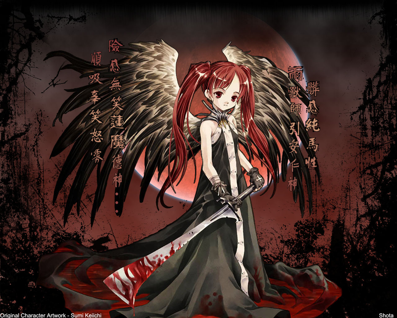 Description: A girl with red hair and wings holding a sword in front of a full moon and blood moon background.