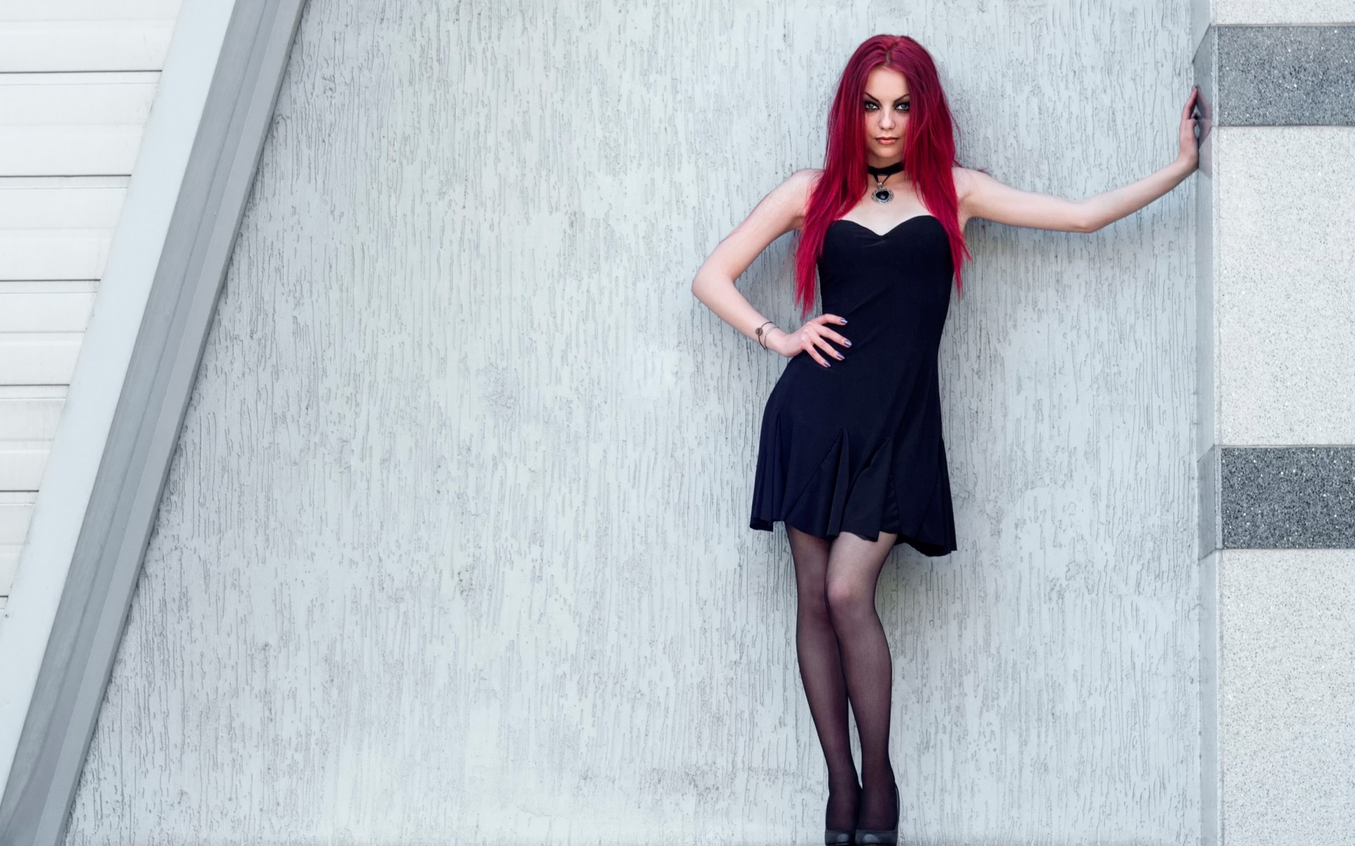 Description: A woman with red hair is posing for a picture in a black dress and black tights and heels.