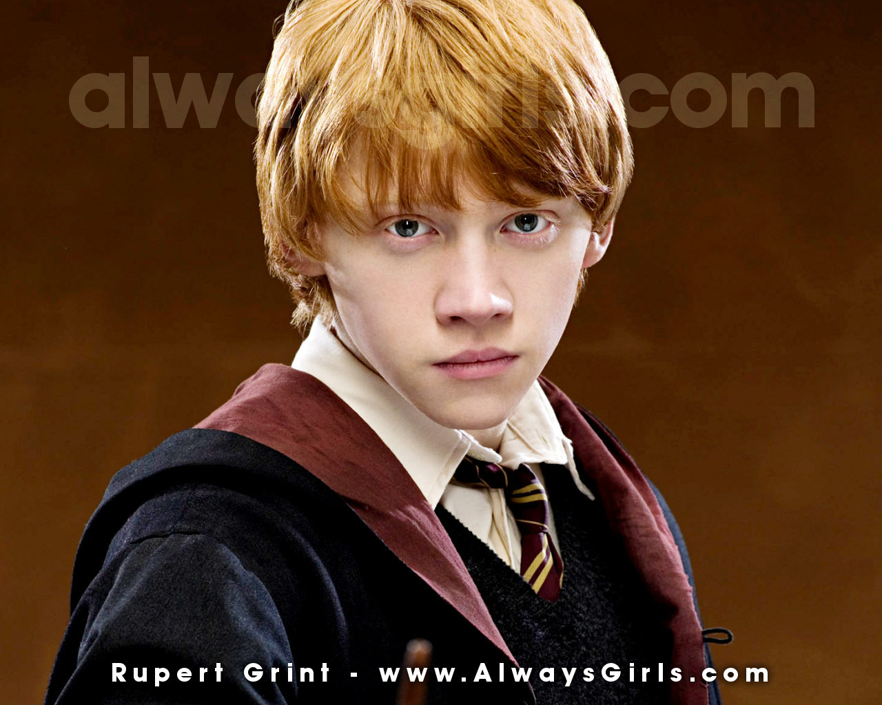 Description: A young man with red hair and a harry potter outfit is posing for a picture in front of a brown background.