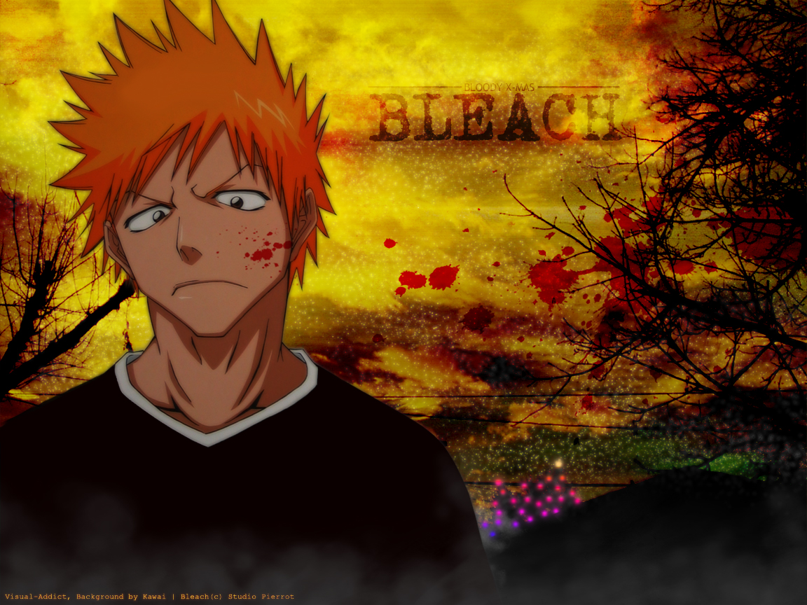 Description: A man with red hair and a black shirt with a red splattered face and a yellow background.